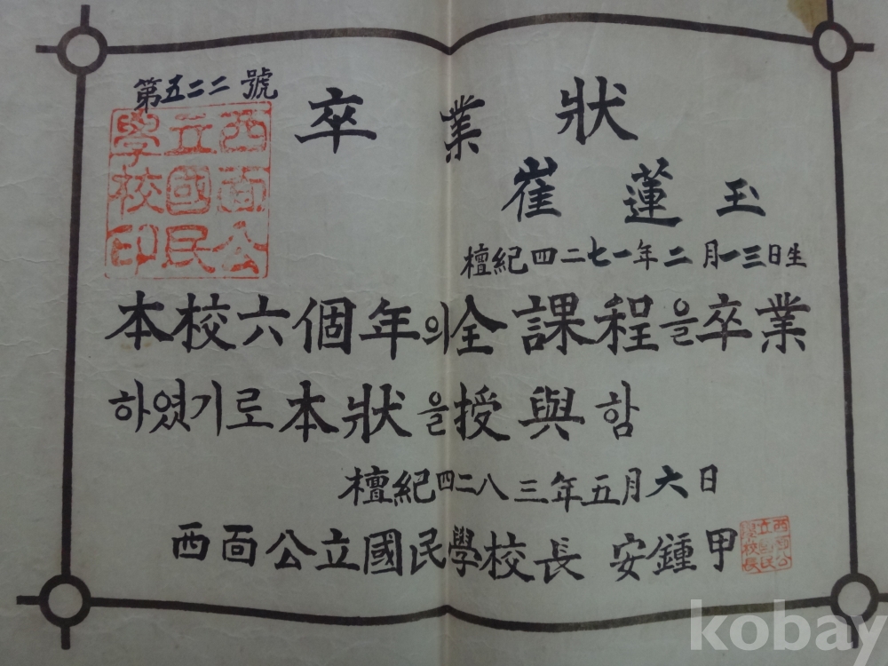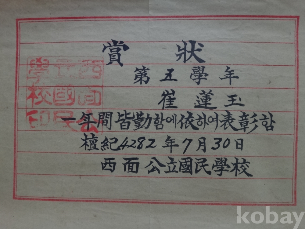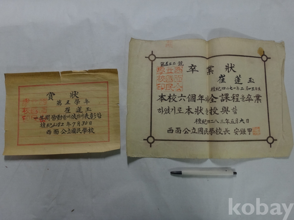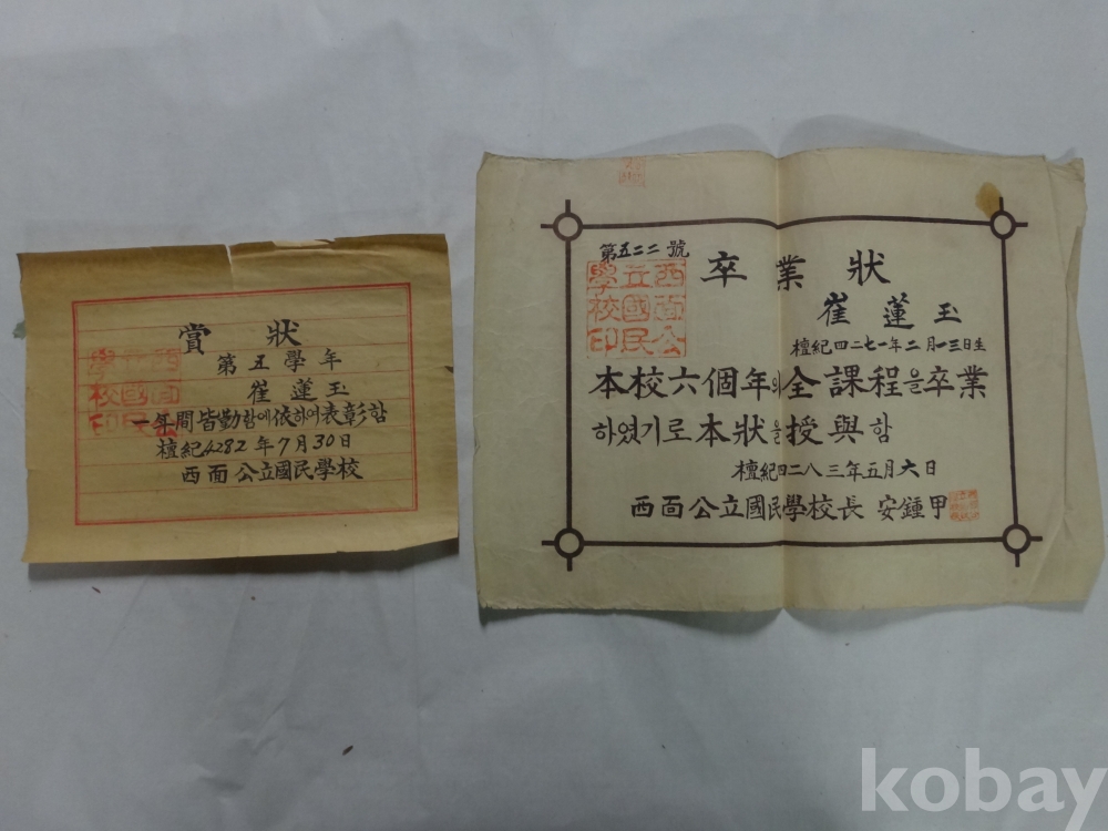 서면공립국민학교 - 졸업장 및 개근상장 (950년. 1949년)