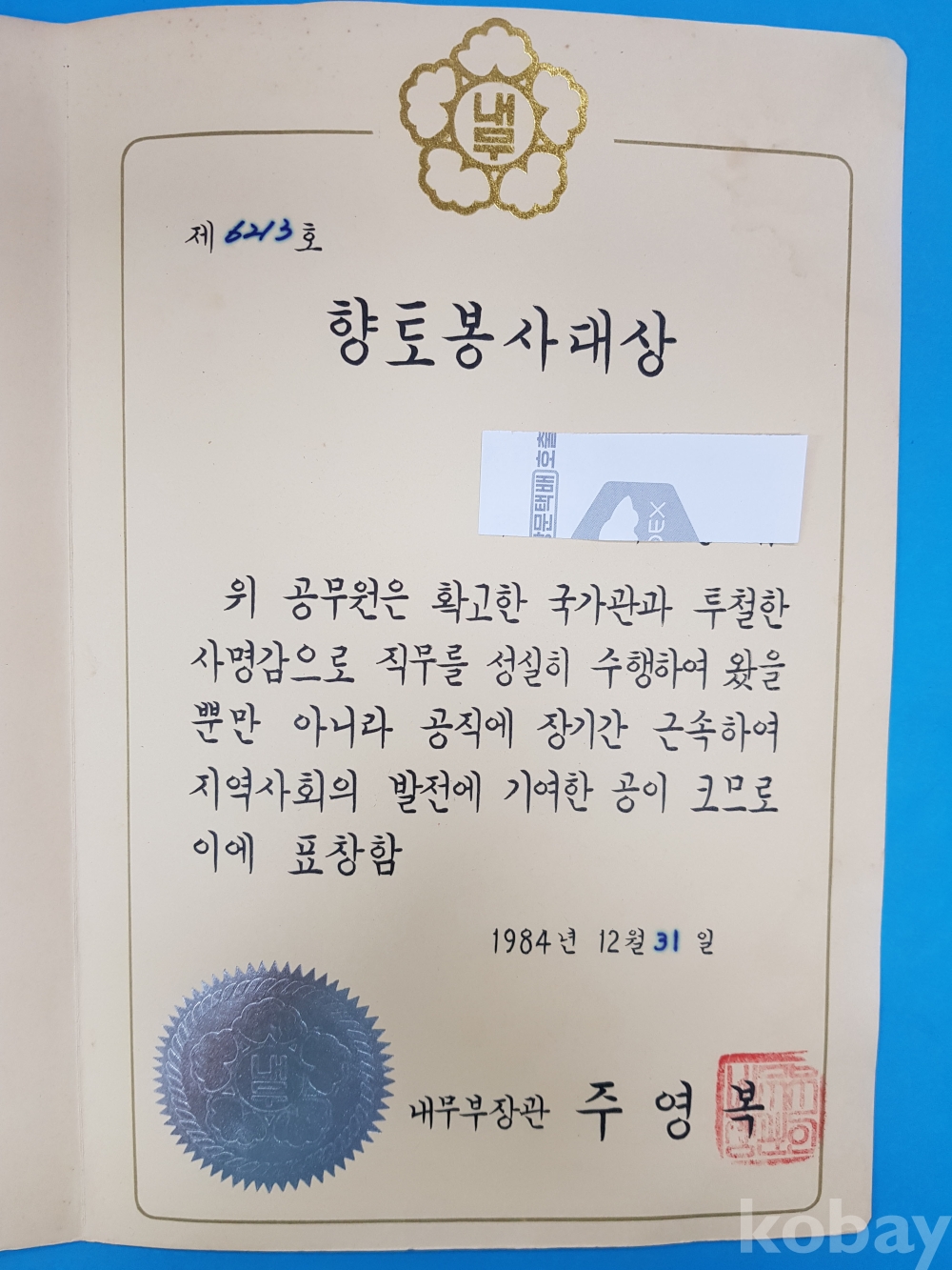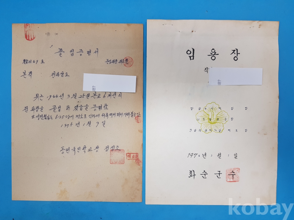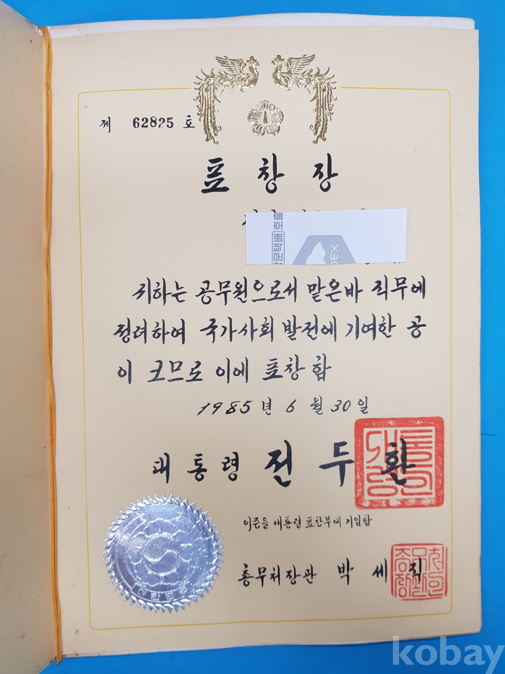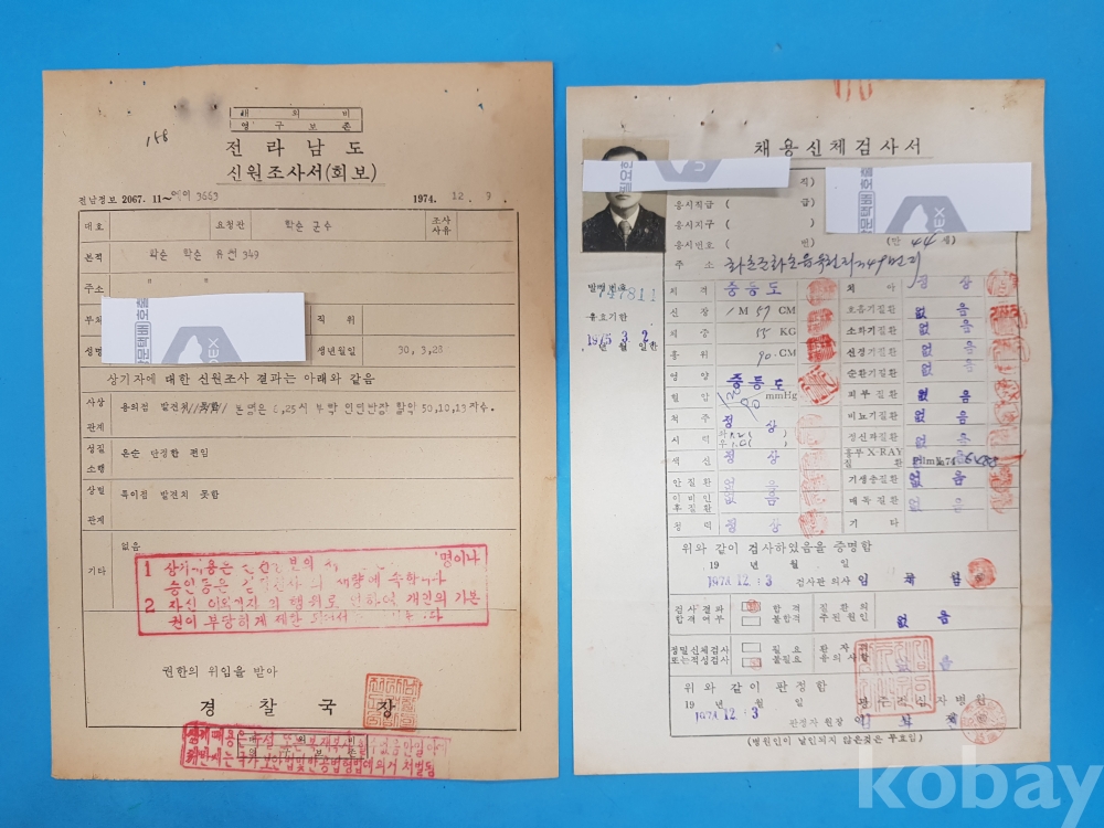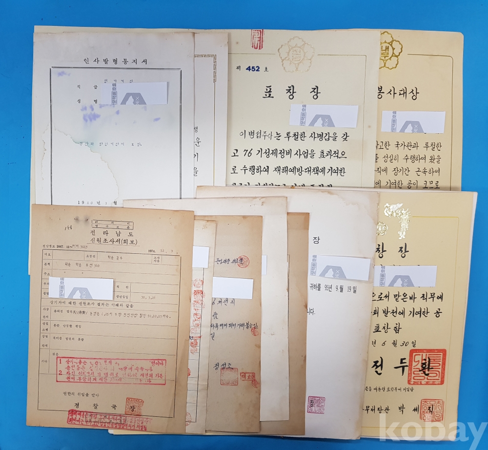 **** 전라남도 신원조사서(회보), 채용신체검사서, 졸업증명서, 임용장, 인사발령통지서, 위촉장 주료증, 향토봉사대상, 표창장(대통령 전두환)등