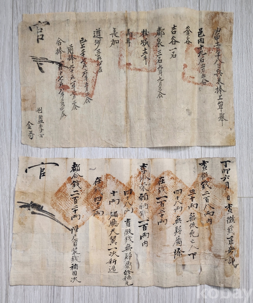 조선시대 경남 영산군(창녕군) 경신년 11월18일 별감수결과 관도장이 찍혀있는 군사들에게 지급할 쌀 목록 2점 입니다 뒤면에 배접흔적 있습니다 오랜세월에 상태 양호한 편입니다 사진 참조바랍니다