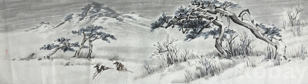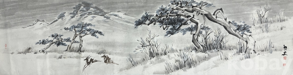 눈 덮인 산과 굽은 소나무, 그리고 그 아래에서 쉬고 있는 사슴 두 마리를 담은 수묵담채 산수화입니다. 먹과 담묵으로 표현된 설경의 차가운 공기감이 절제된 붓 터치로 그려져 있으며, 화면 전체에 잔잔한 정적과 고요한 기운이 흐릅니다. 바람에 굽은 소나무의 형태와 산등성이의 흐름이 자연스럽게 이어지며, 수묵의 농담과 붓의 여백 처리에서 작가의 노련한 감각이 느껴집니다. 동양화 특유의 여운과 계절감이 살아 있어 인테리어용이나 수집용으로 모두 적합한 작품입니다.