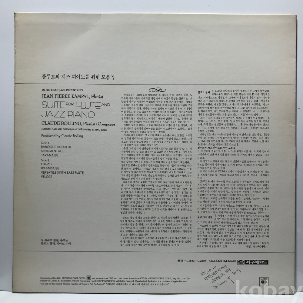 LP 35,750-87 JEAN PIERRE RAMPAL - SUITEFOR FLUTE AND JAZZ PIANO CLAUDE BOLLING . 85 지구 자켓 EX 알판 EX