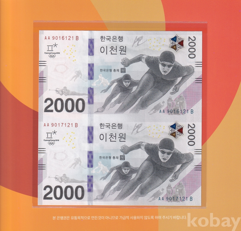- 2018년 평창 올림픽기념 2,000원 초판 AAB 9016121 / AAB 9017121 - 2연결권 미사용 지폐 입니다.