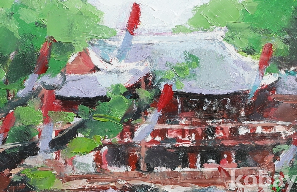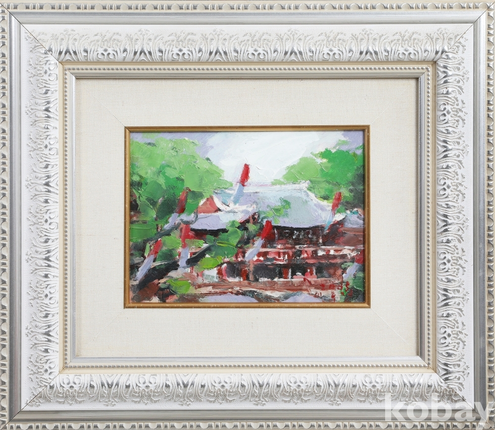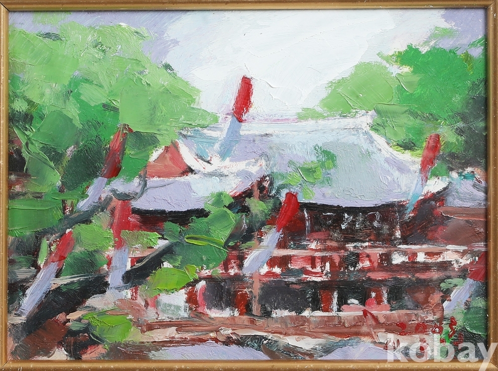 본 작품은 한국 서양화단에서 활동하는 이두영 작가의 유화 작품입니다. 녹음이 우거진 배경 속에서 한국적인 건축물의 지붕선과 붉은 기둥이 돋보이는 고즈넉한 풍경을 담아냈습니다.