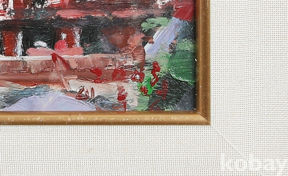 작가 특유의 두껍고 생동감 있는 붓 터치를 사용한 마티에르(Matière) 기법이 화면 전체에 걸쳐 두드러집니다. 짙은 녹색과 강렬한 붉은색, 그리고 흰색의 대비를 통해 대상의 형태를 해체적으로 표현하면서도, 현장의 빛과 강렬한 에너지를 역동적으로 포착한 수작입니다. 작은 사이즈이지만 밀도 높은 구성을 통해 뛰어난 소장 가치를 지닙니다.