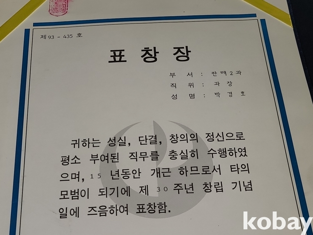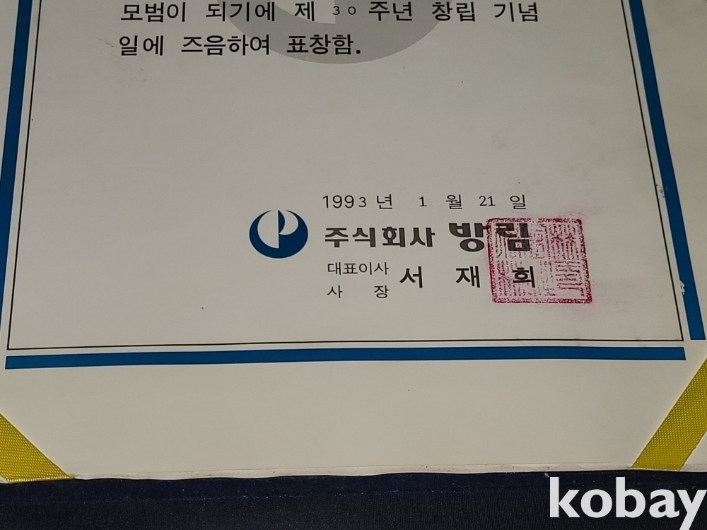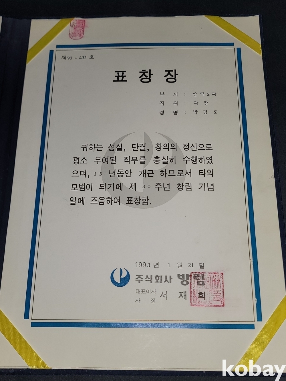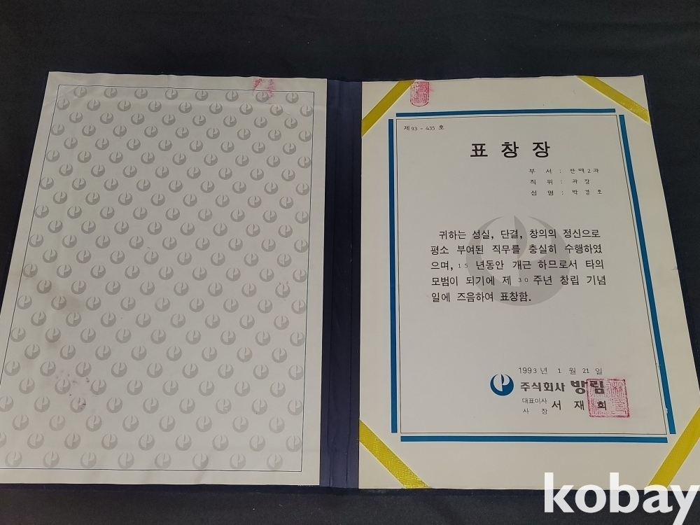 빈티지 1993년 섬유회사 방림에서 수여한 옛날 표창장입니다.