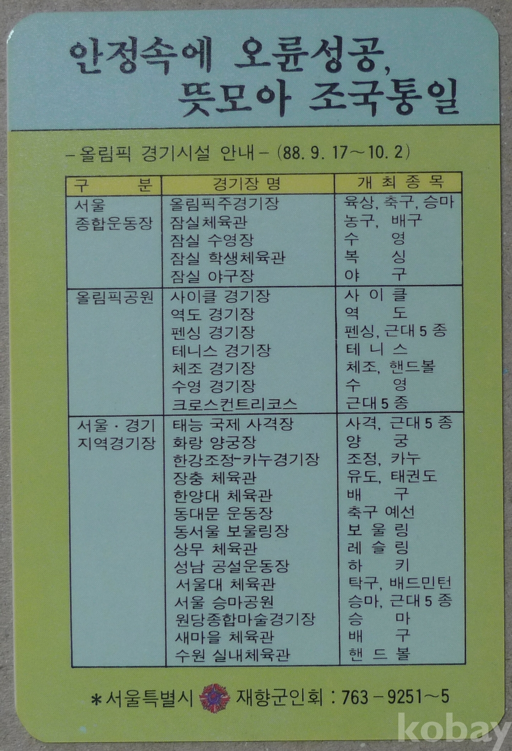 1988년 서울올림픽 경기 시설 안내 포켓 카드