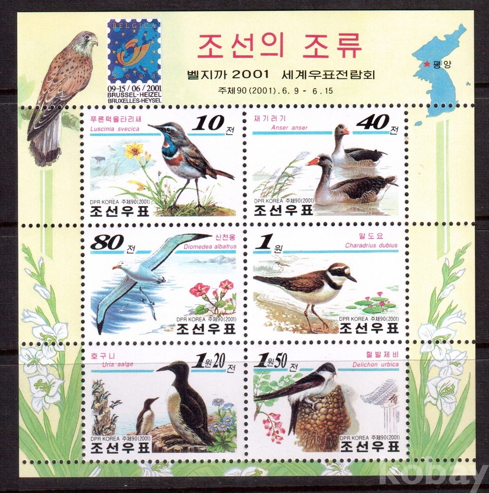 (조류) 북한 2001.6.9 조선의 조류 (<<벨지까 2001>> 세계우표전람회 sheet of 6 MNH