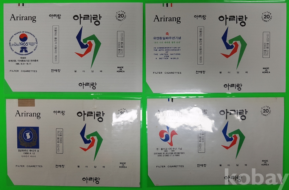 **** 아리랑 담배포갑지 (기념담배)/한.불수교100주년기념, 유엔창설40주년기념, 창설18주년 예비군의날 1986.4.12.,제40차 세계은행/국제통화기금 연차총회