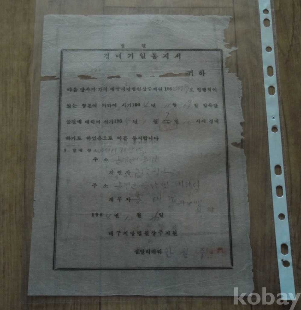 1964년 경매기일통지서(대구지법 상주지원)