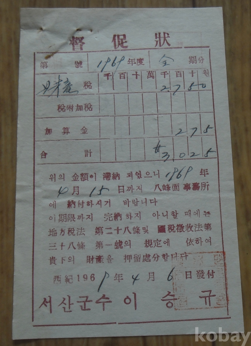 옛 영수증(계산서): 1969년 재산세 독촉장(서산군)