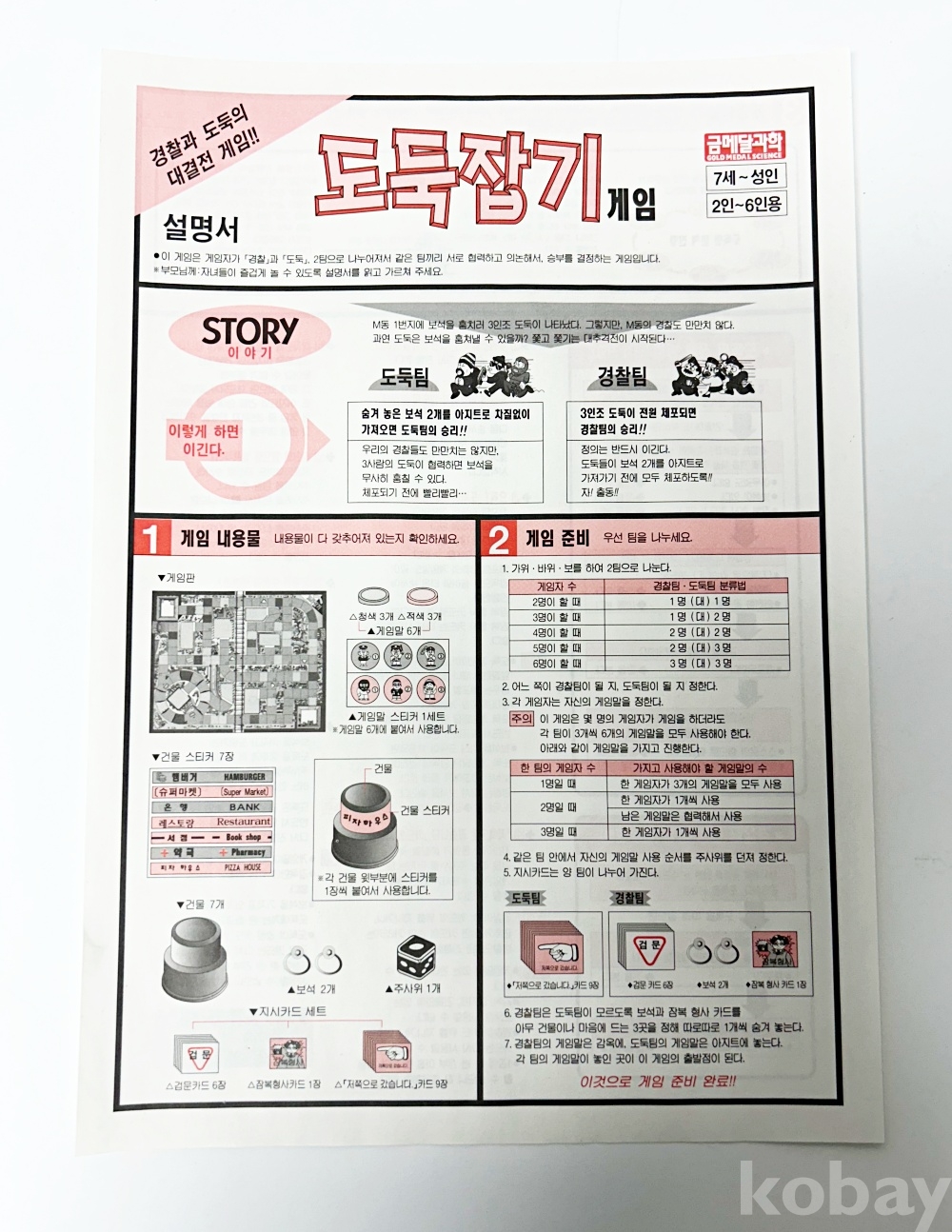 상품설명 | 경찰과 도둑 두 팀으로 나뉘어 도둑을 모두 체포하는 것을 목표로 하는 추리형 보드게임 '도둑잡기'이다. | ||
