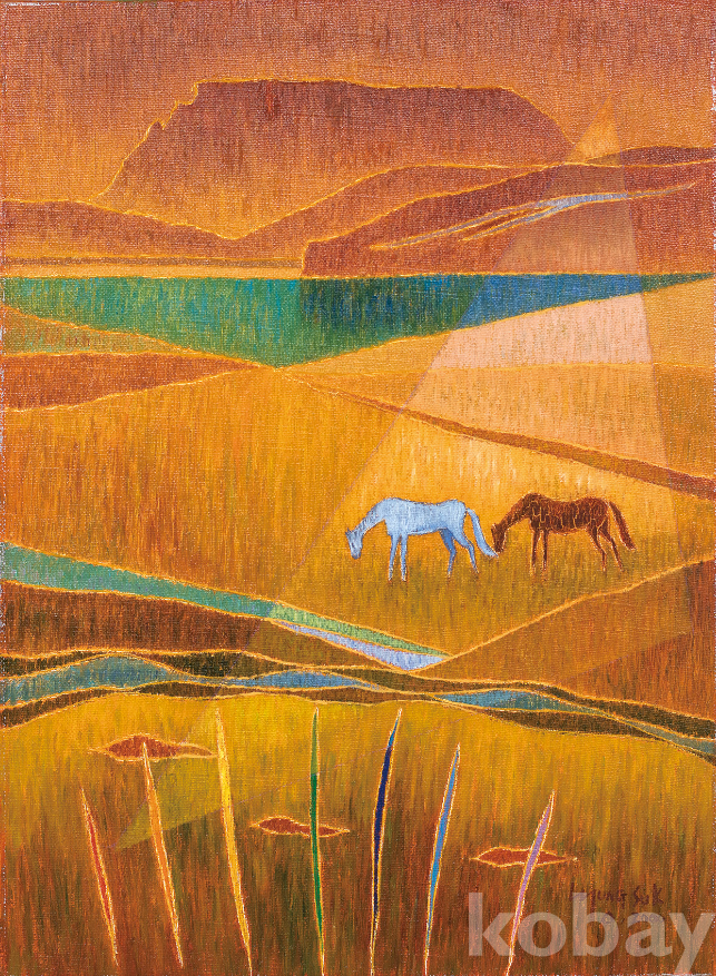 두 마리의 말은 평화와 생명의 순환을 상징하며, 부드러운 음영과 절제된 색면 구성이 조화를 이루어 작품 전체에 안정감과 깊이를 부여한다.