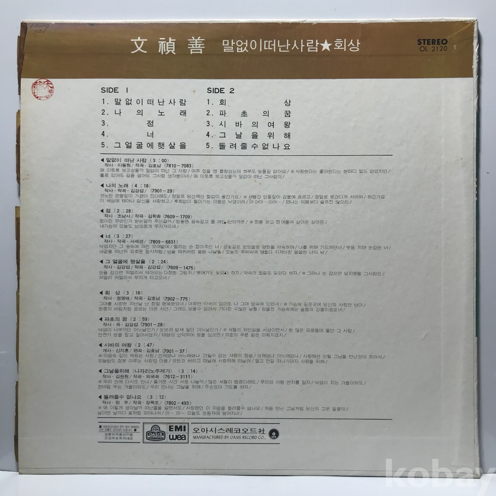 LP 36,750-35 문정선 독집 - 말없이 떠난 사람/ 회상 . 79 오아시스 자켓 EX+ 알판 EX+