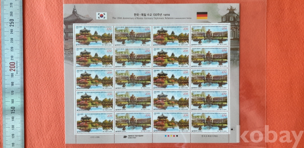 2013 한국 - 독일 수교 130주년 기념 270원 20매 전지 입니다.