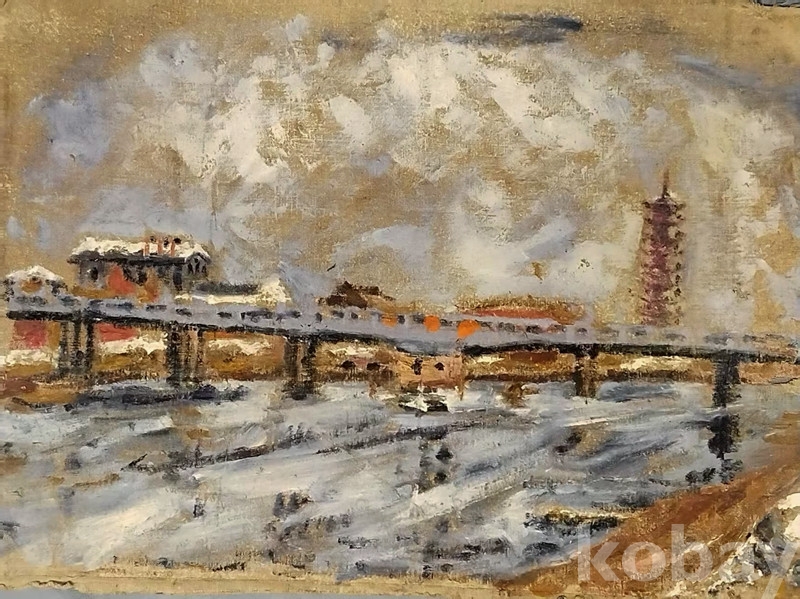 1940년대 커다란 사원 탑이 보이는 강과 주변풍경을 그린 추상사의화 작품으로