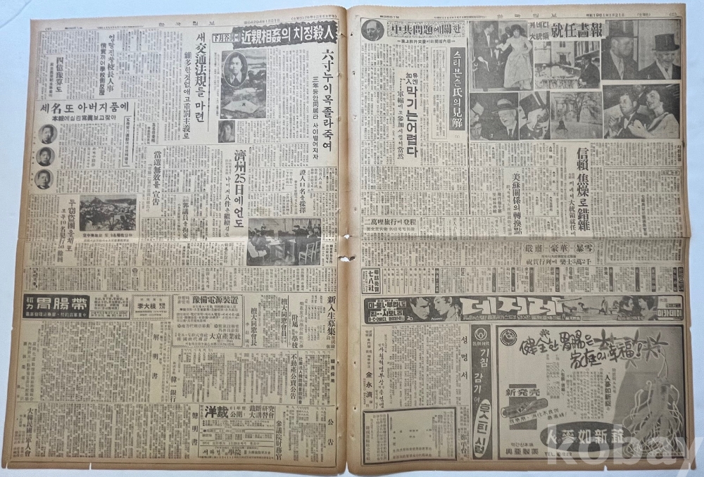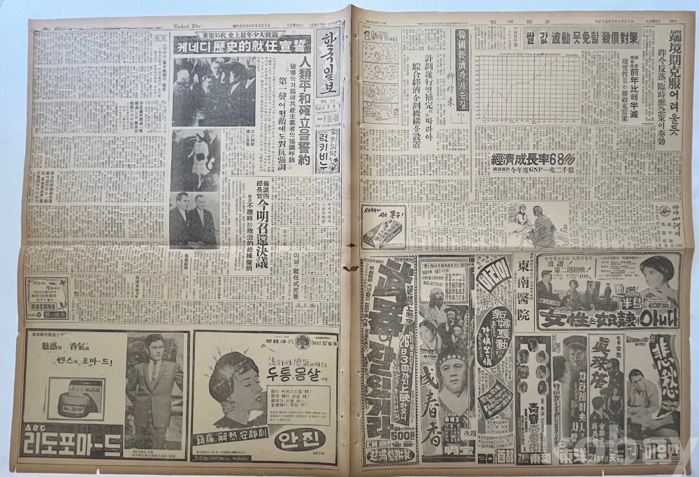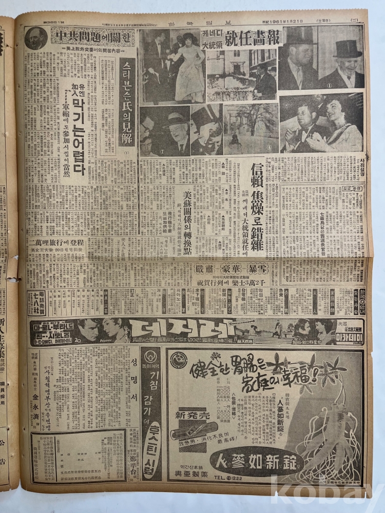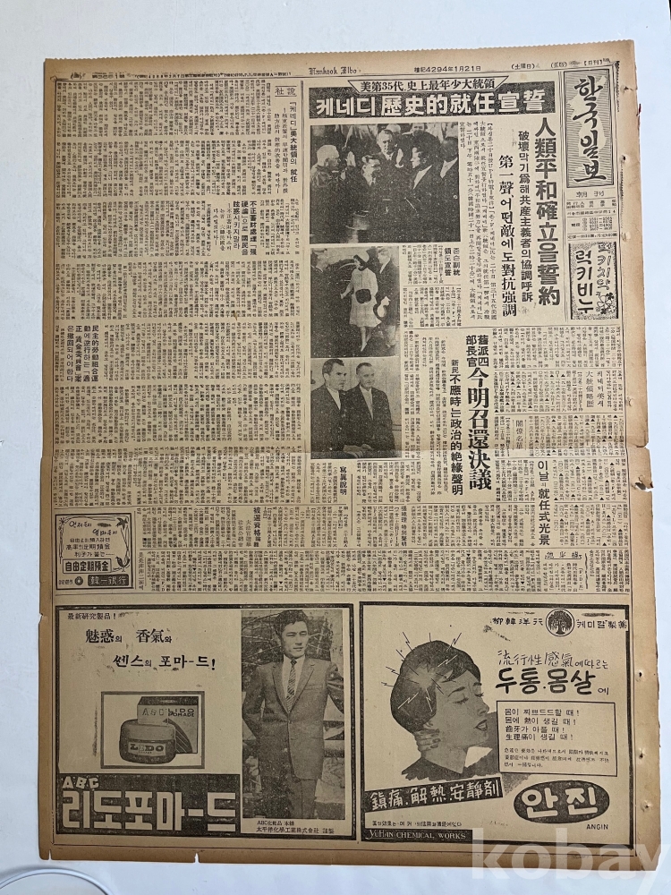 미국 35대 케네디 대통령 취임 기사가 실린 1961년 한국일보 낱장입니다. (2장이 이어진 낱장)