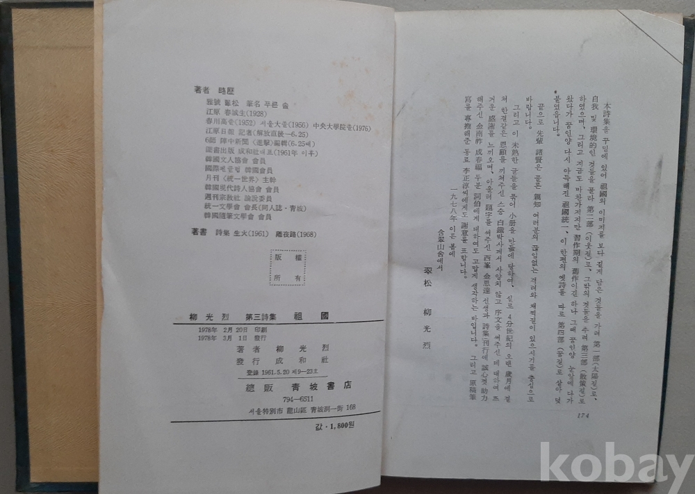조국-류광열 시집 1978년 성화사 발행 저자 서명증정본