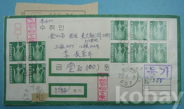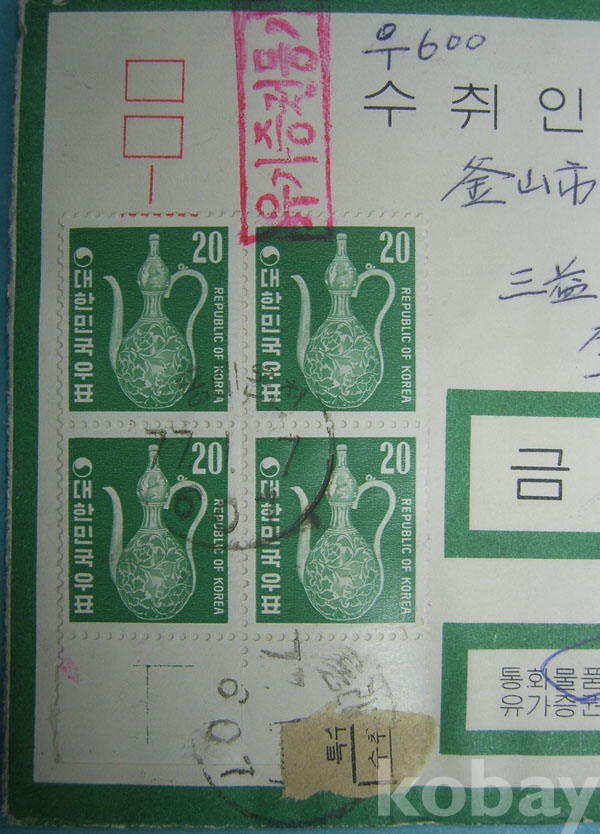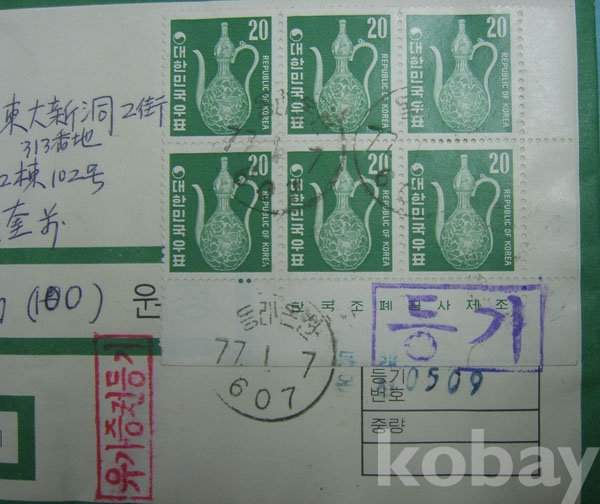 **** 제1차그라비아 20원 청자수병 명판부 10매, 문합, 섬말나리 첩부 유가증권등기 실체*유가증권등기 고무인*동래온천,77.1.7 철인, 로라인*우편물수령증 포함