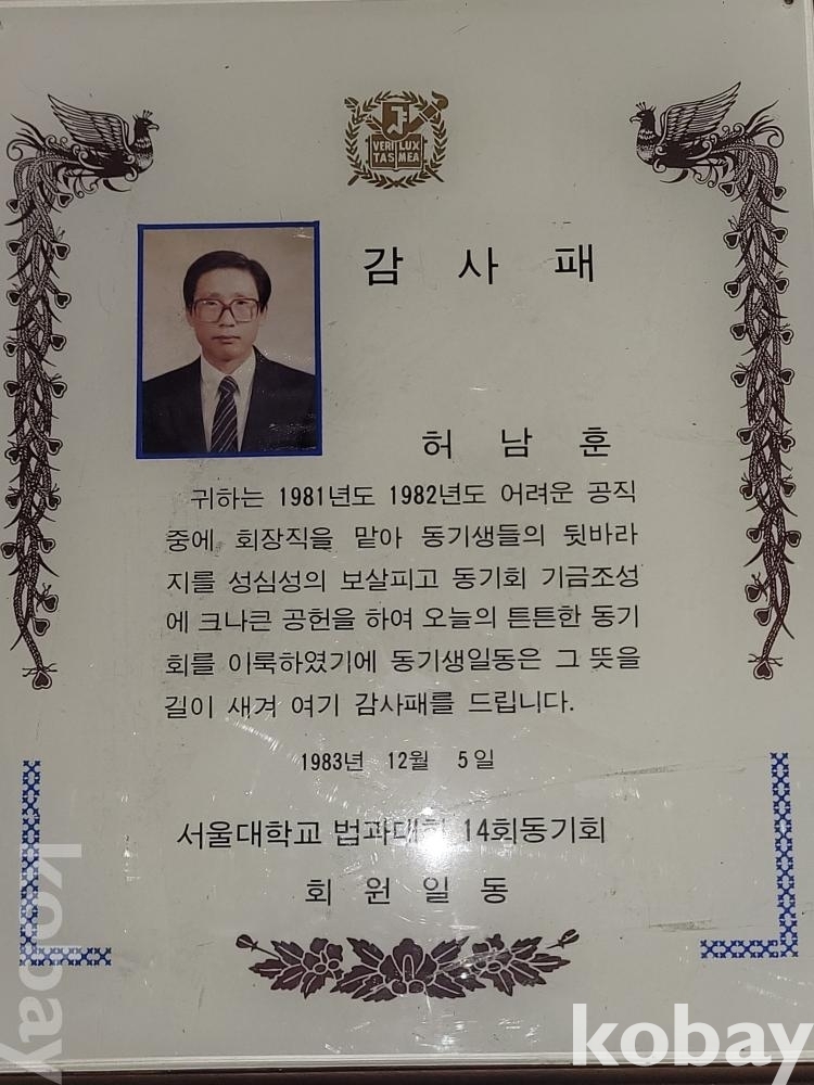 빈티지 1983년 서울대학교 법과대학 14회 동기회 회장직 감사패입니다.