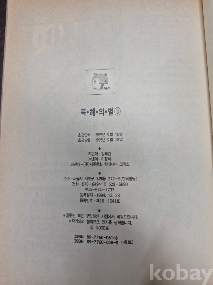 1995년 초판 김혜린의 대하 순정극화 북해의 별 낱권 4점 일괄 15.5*22.5*1.5