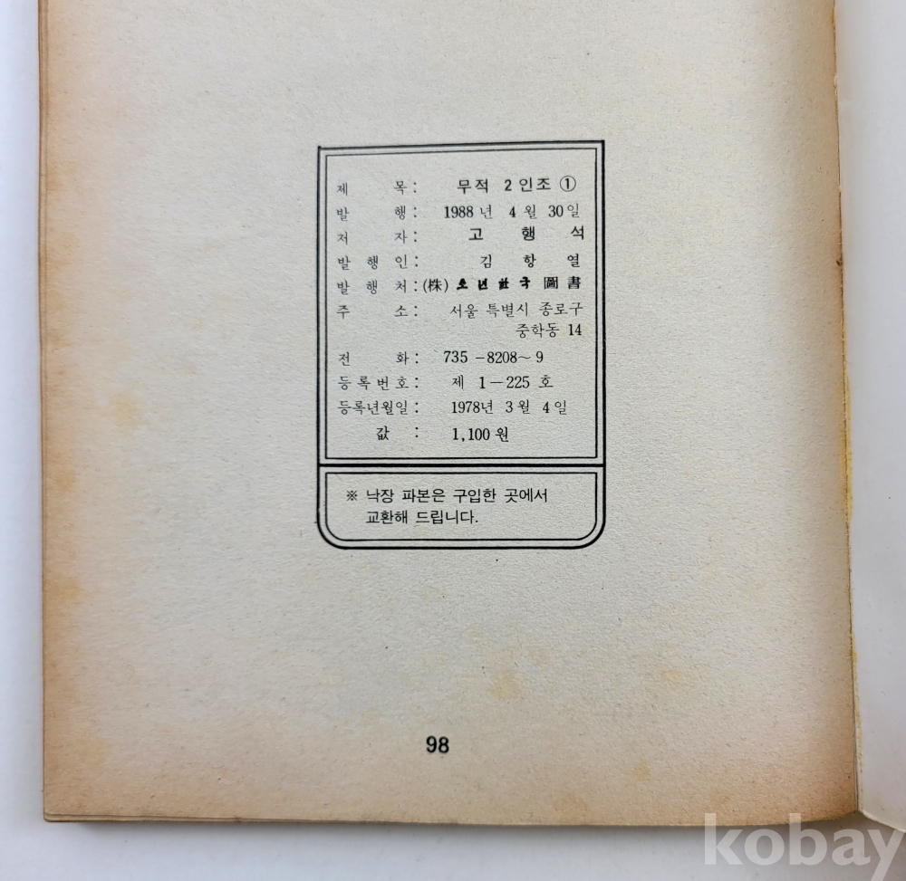 물 품 명 | 고행석 / 무적 2인조 (1~6)완결 총6권 / 1988년 초판 / 소년한국도서 |