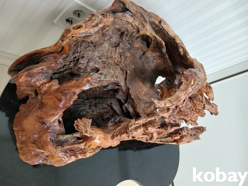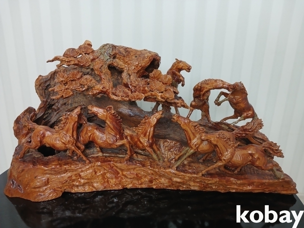 괴목의 통나무에 8마리의 말을 다양한 모습으로 조각하여 표현한 공예품 입니다.