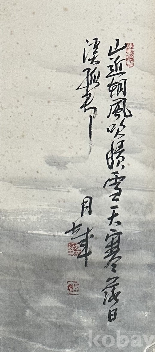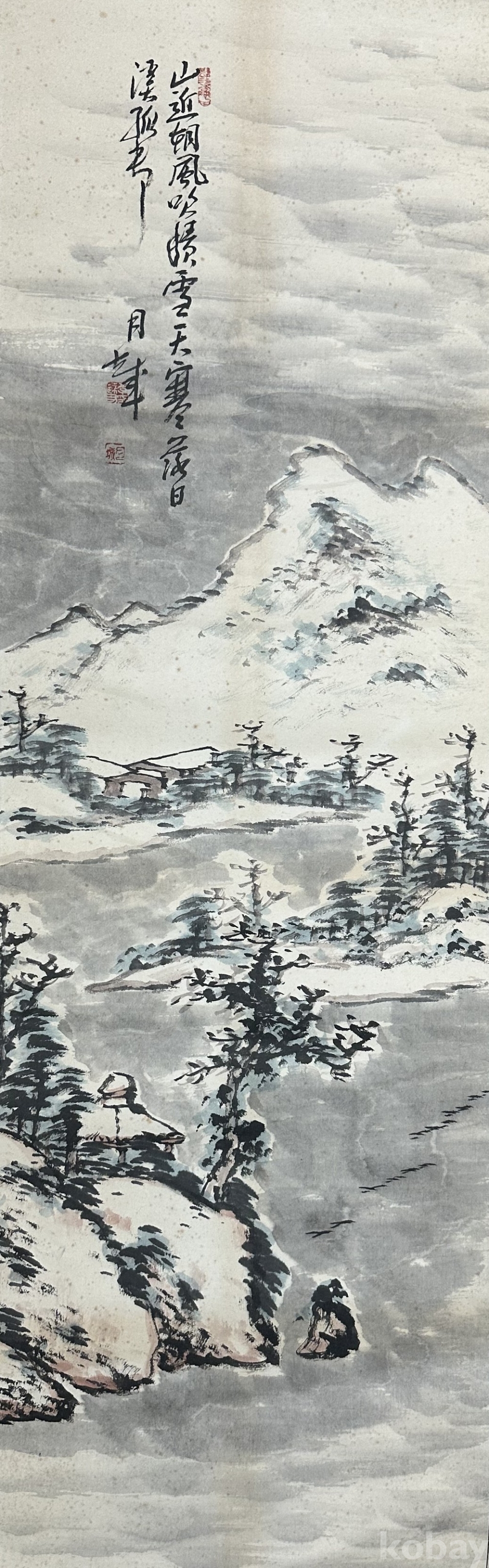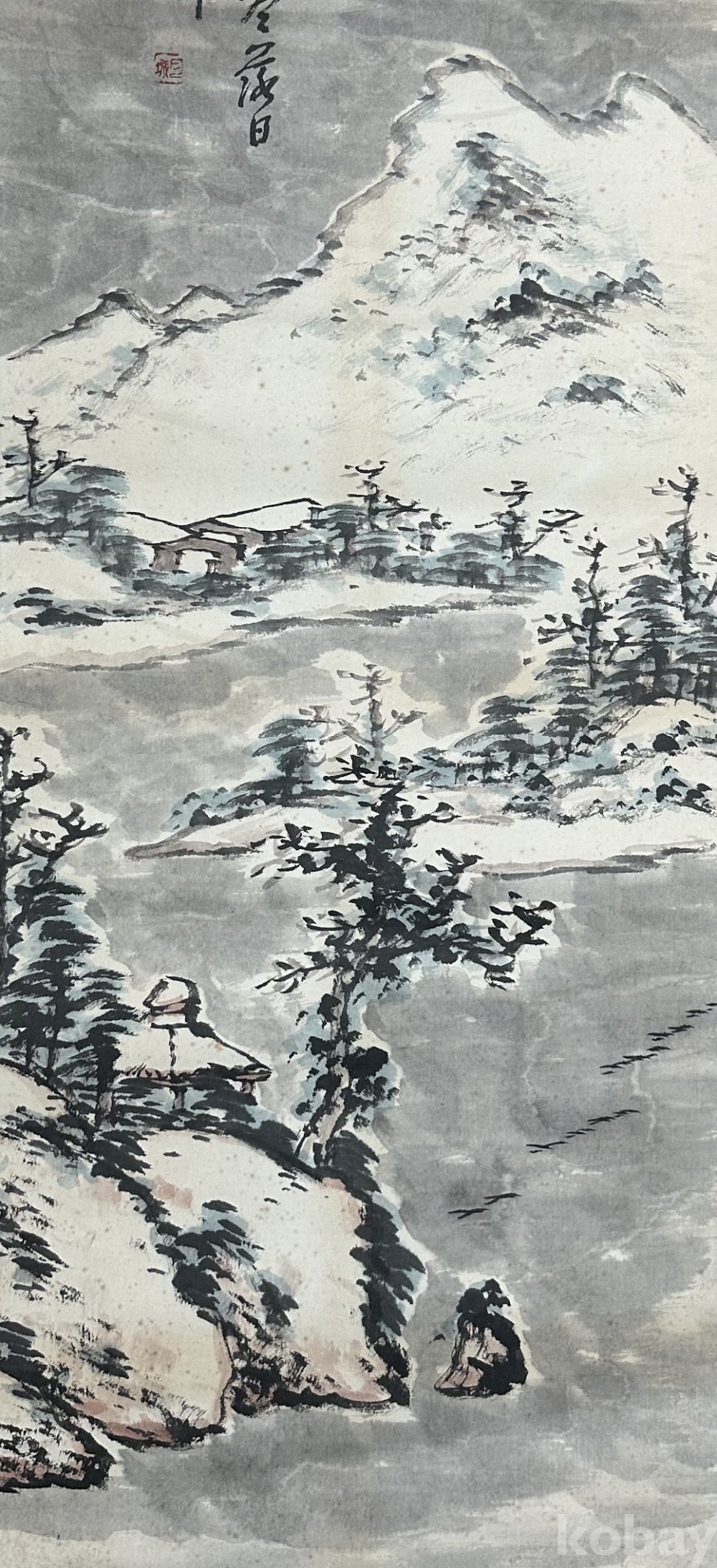 짙은 먹과 담묵으로 표현된 겨울 산수화로, 설산 위로 안개가 자욱하게 감돌며 고요한 아침의 풍경을 그렸습니다. 봉우리와 수목의 묘사가 간결하면서도 힘이 있으며, 회색조의 먹빛과 엷은 청색의 번짐이 어우러져 차분한 겨울 정경을 느낄 수 있습니다. 아래쪽에는 바위와 나무가 균형 있게 배치되어 전체 구도가 안정적이고, 문인화풍의 담백한 멋이 잘 드러납니다.