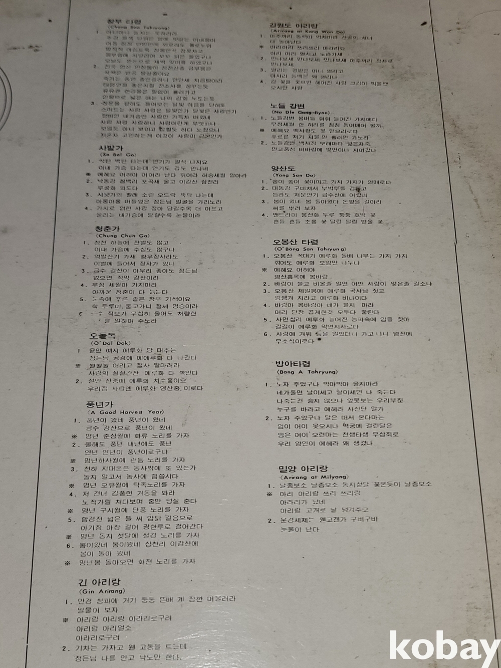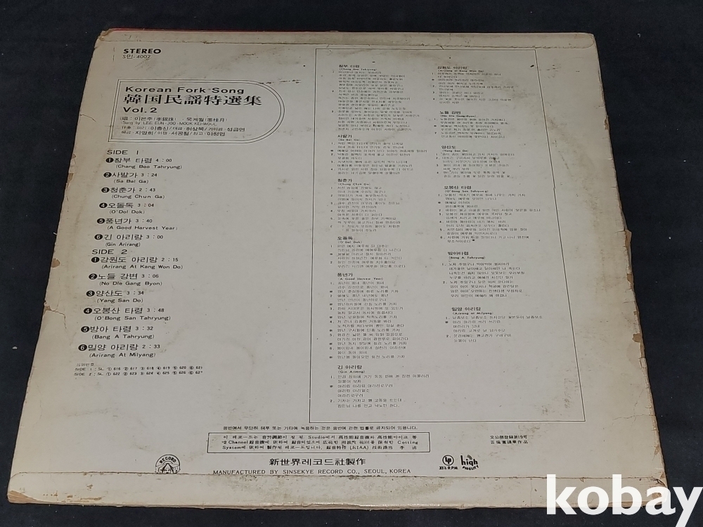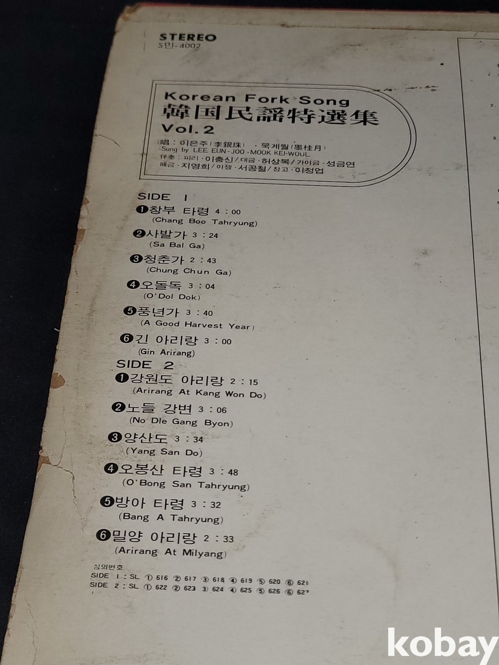 SIDE 2 1. 강원도 아리랑 2. 노들 강변 3. 양산도 4. 오봉산 타령 5. 방아타령 6. 밀양 아리랑