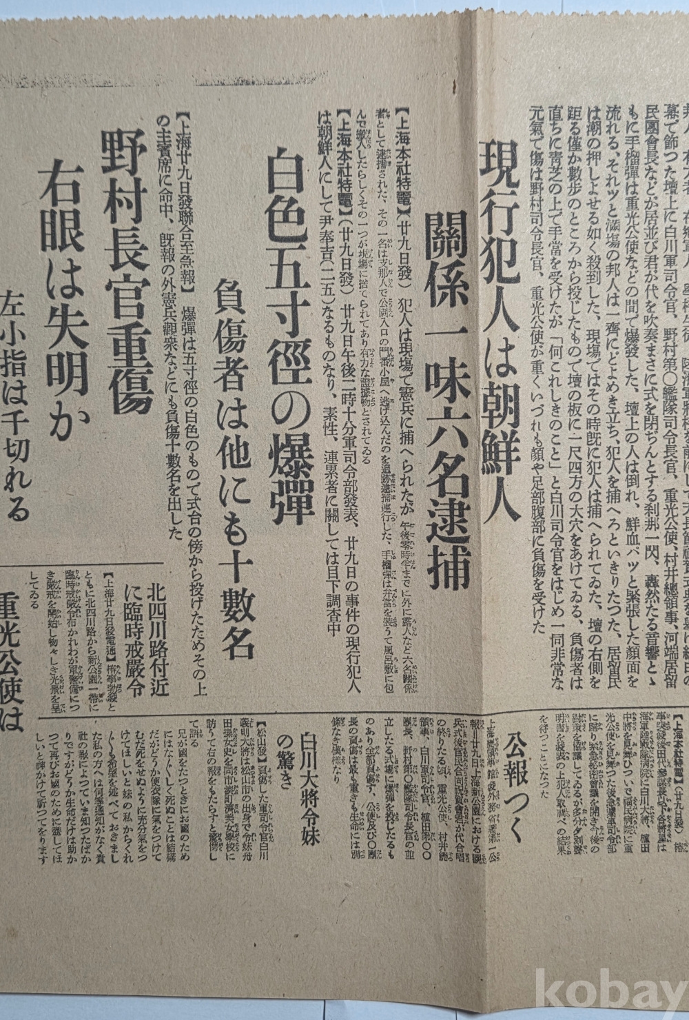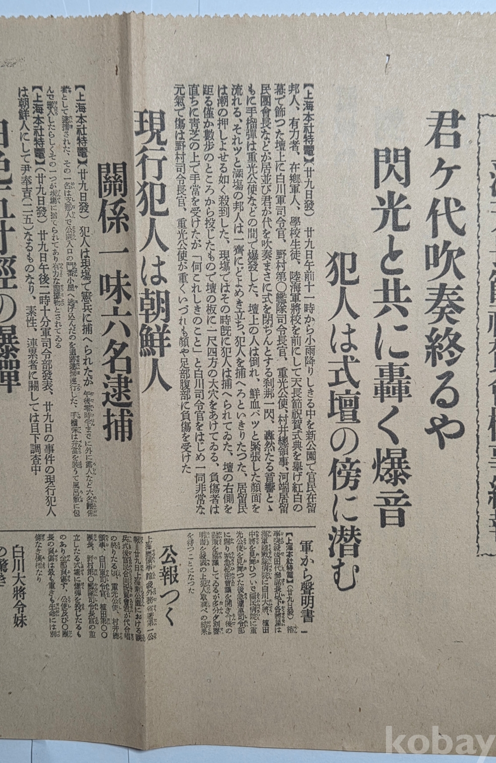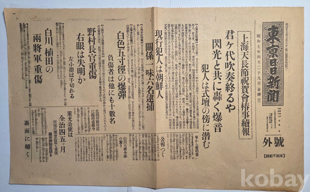 설명 | 1932(소화7)년 4월 29일 윤봉길 의사의 홍구(虹口)공원 의거 당일 일본 동경일일신문(東京日日新聞)에서 발행한 호외 1점이다. '상해 천장절 축하회 춘사 속보(上海天長節祝賀會椿事續報)'라는 헤드라인 뒤로 '기미가요 취주 끝나자 섬광과 같이 울린 폭음'(君ヶ代吹奏終るや閃光と共に轟く爆音)이 있다. 특히 '현행범인은 조선인(現行犯人は朝鮮人)'에 윤봉길(尹奉吉) 의사의 실명이 거론되었다. 양면 인쇄, 상태 양호합니다.