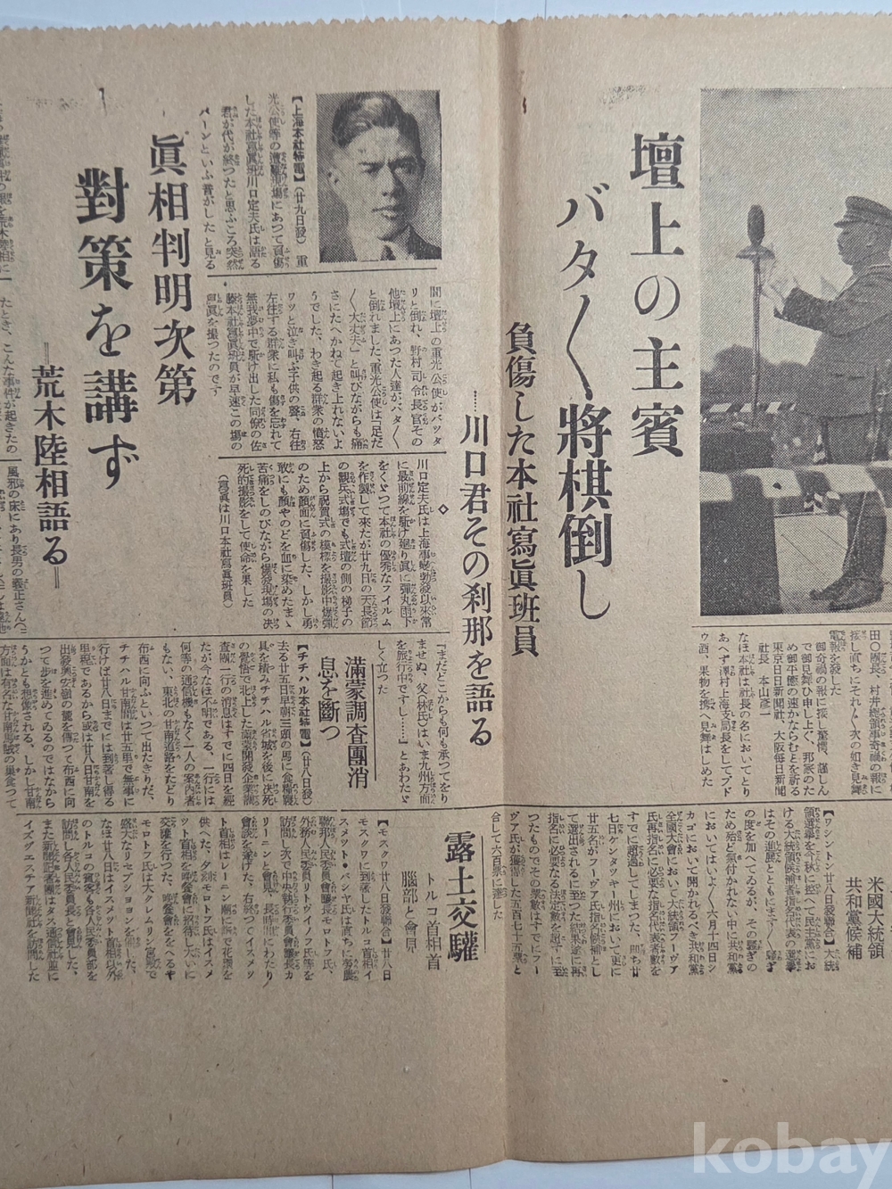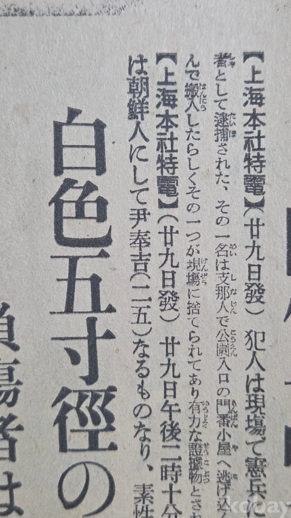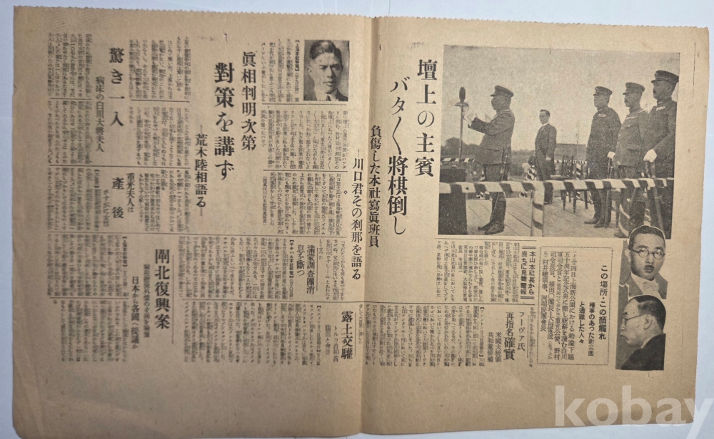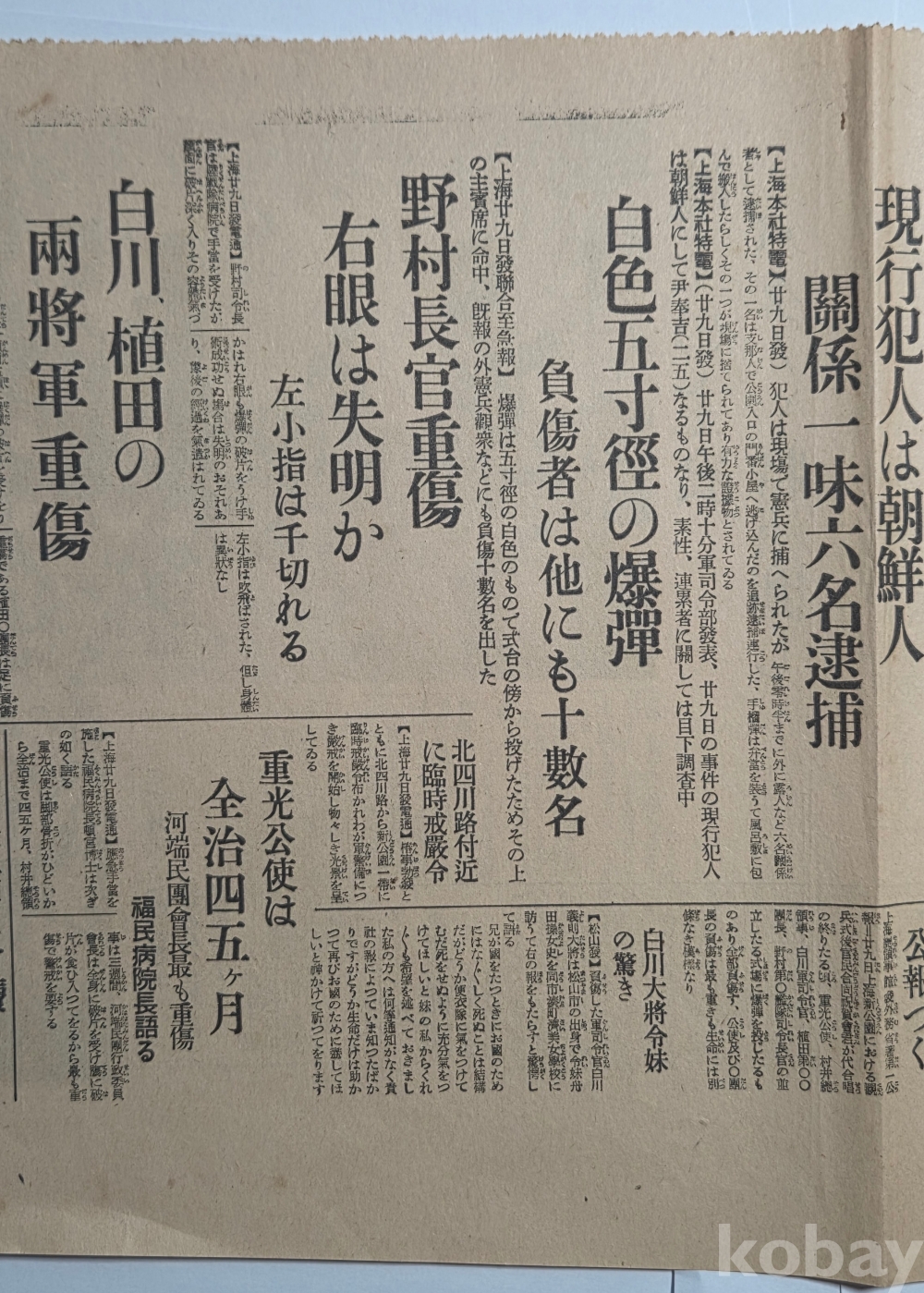 설명 | 1932(소화7)년 4월 29일 윤봉길 의사의 홍구(虹口)공원 의거 당일 일본 동경일일신문(東京日日新聞)에서 발행한 호외 1점이다. '상해 천장절 축하회 춘사 속보(上海天長節祝賀會椿事續報)'라는 헤드라인 뒤로 '기미가요 취주 끝나자 섬광과 같이 울린 폭음'(君ヶ代吹奏終るや閃光と共に轟く爆音)이 있다. 특히 '현행범인은 조선인(現行犯人は朝鮮人)'에 윤봉길(尹奉吉) 의사의 실명이 거론되었다. 양면 인쇄, 상태 양호합니다.