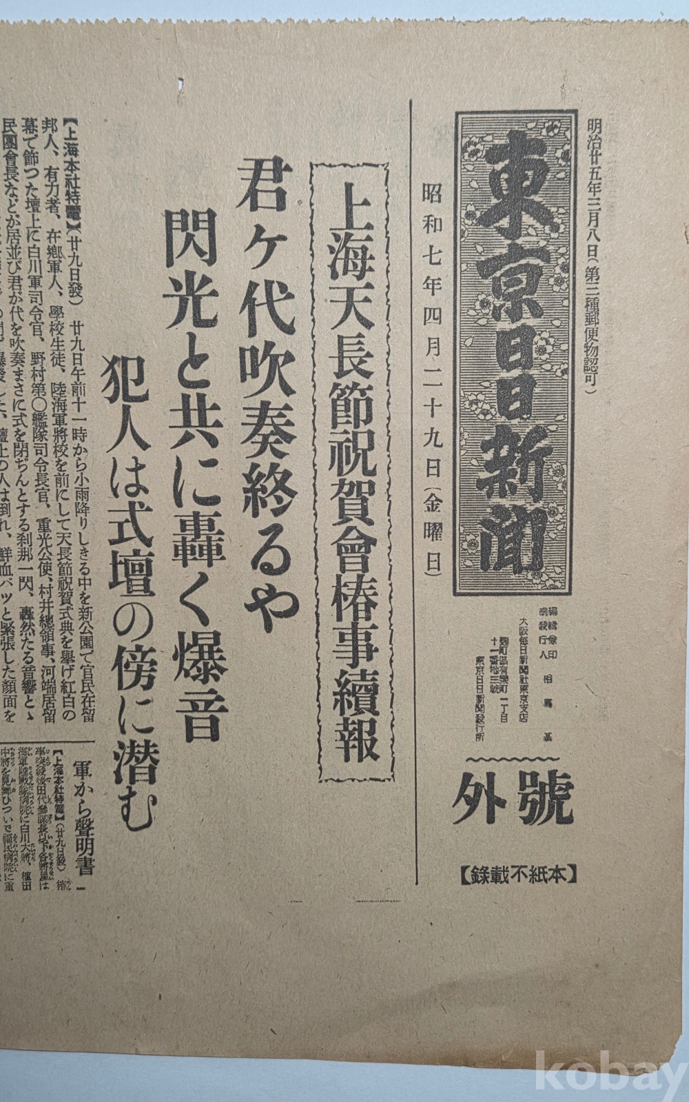 상품명 | 1932년 4월 29일 자 동경일일신문(東京日日新聞) 호외 | ||