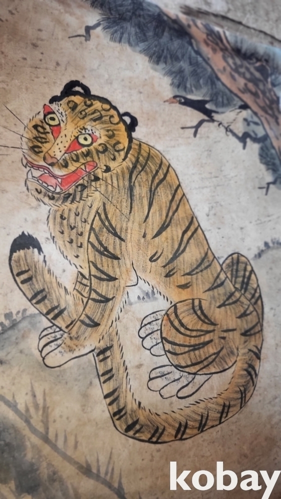 소나무에 앉이있는 까치의 모습과 웃고있는 해학적인 호랑이의 조화가 매우 아름다운 민화로 명품입니다,