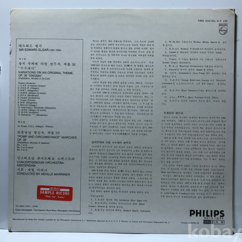 LP 36,350-20 엘가 창작 주제에 의한 변주곡 작품 36 / 위풍당당 행진곡 작품 39 . 82 성음 자켓 EX+ 알판 EX+