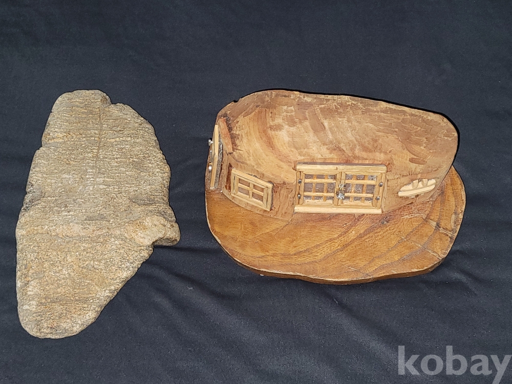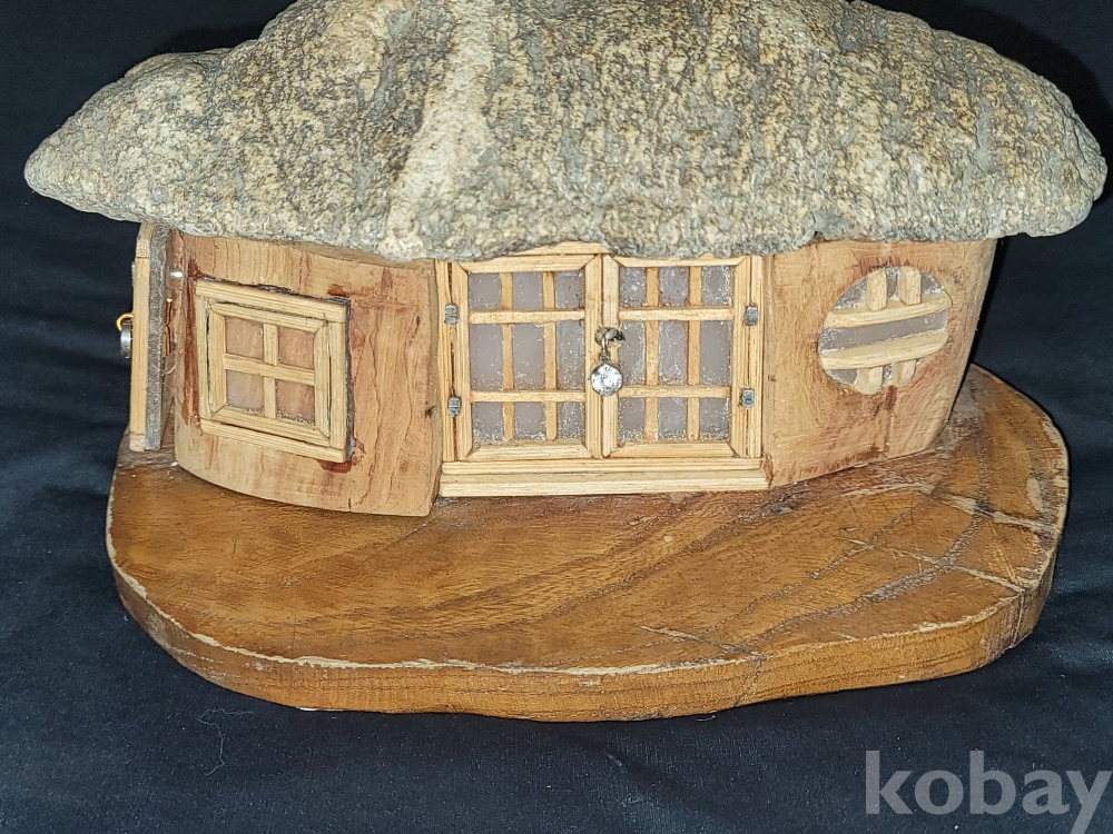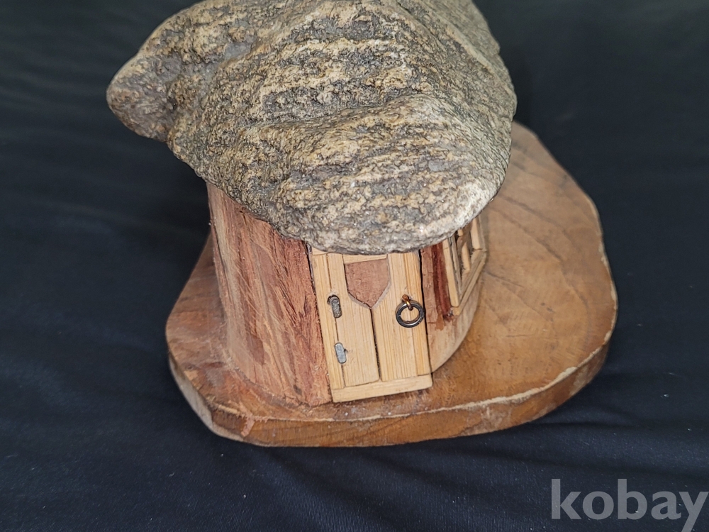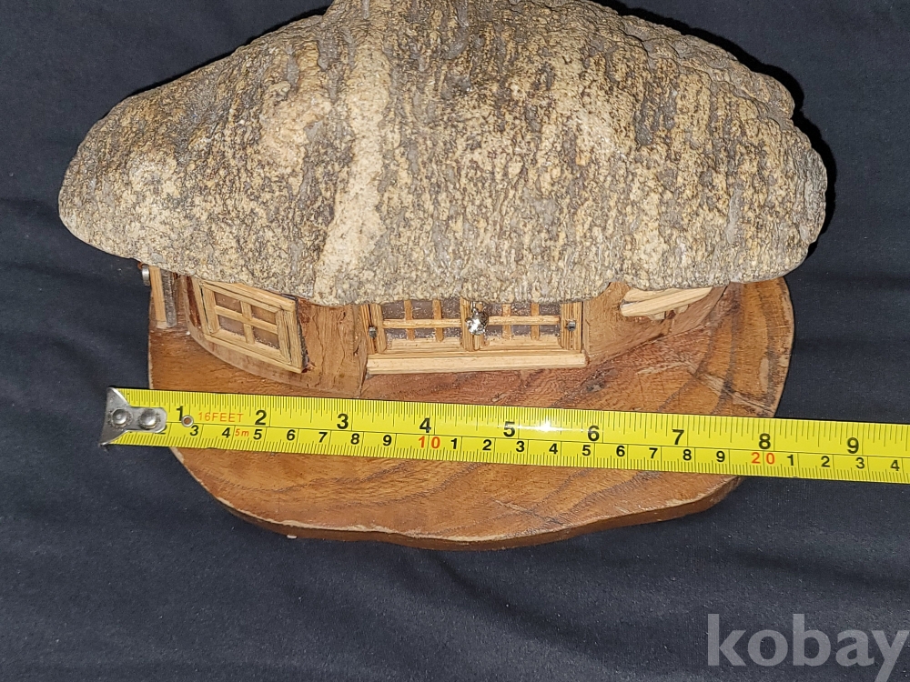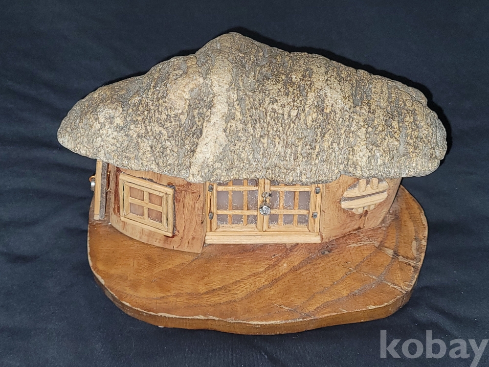 빈티지 세월 감이 느껴지는 초가집 지붕 모양 특이한 돌과 나무 등으로 만든 공예품 장식입니다.