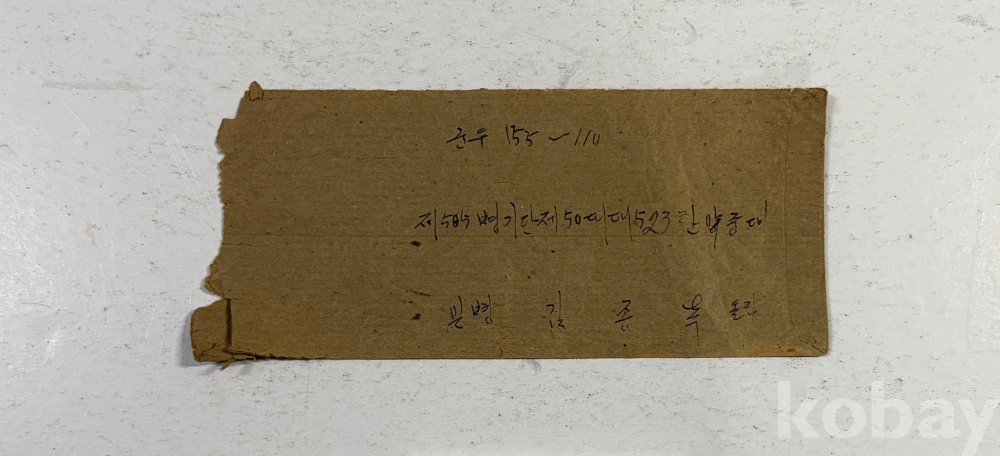 6.25전쟁 참전군인 일병 김종복씨가 (군우 155-110 제 505병기단 제50대대 523탄약중대) 충남 예산군 김종수씨에게 보내는 편지 봉투.