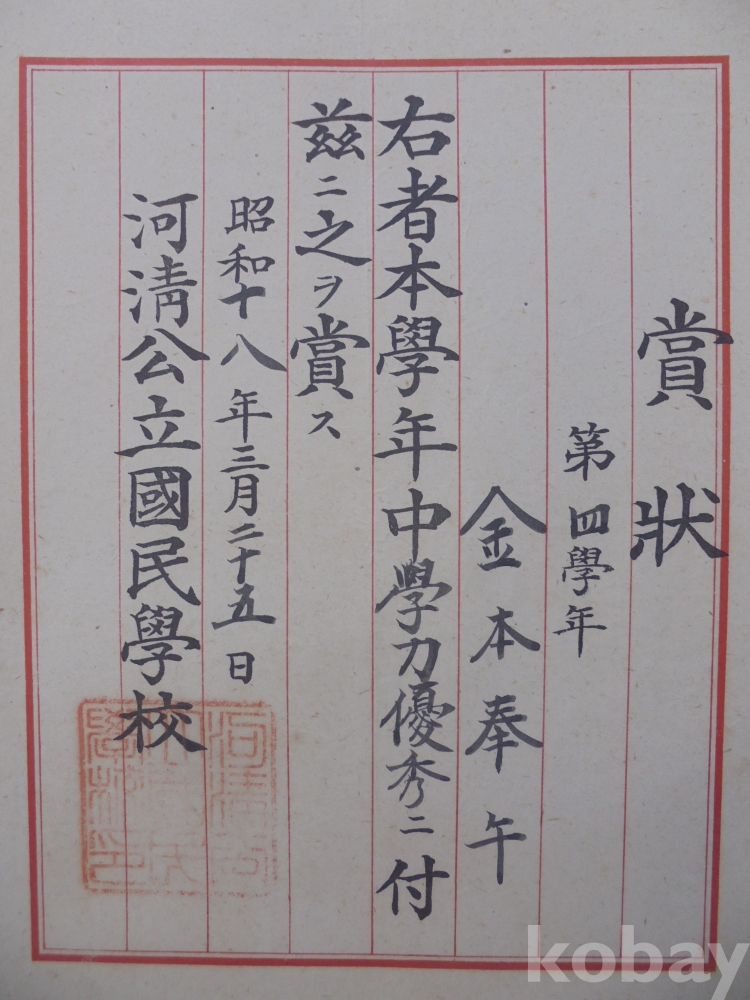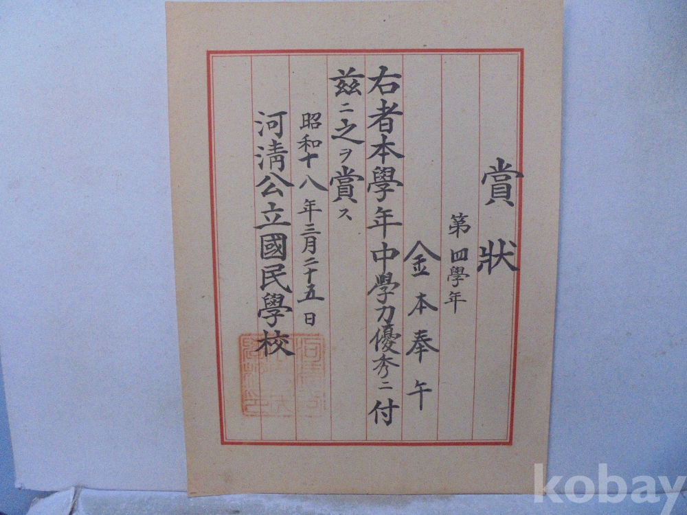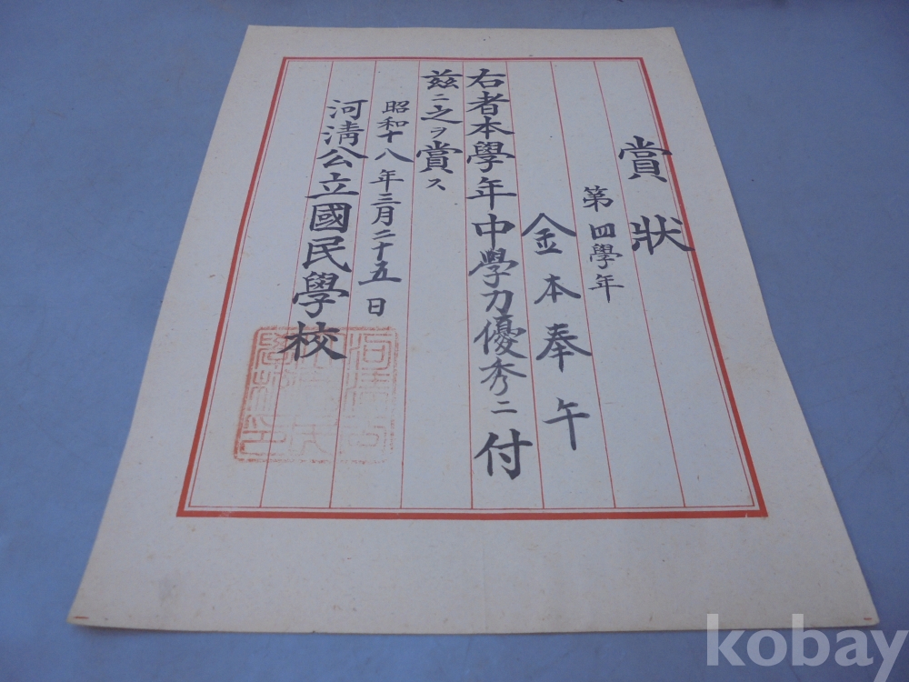 1943년 하청공립 국민학교 제 4 학년 상장 ( 희귀 근대사 )