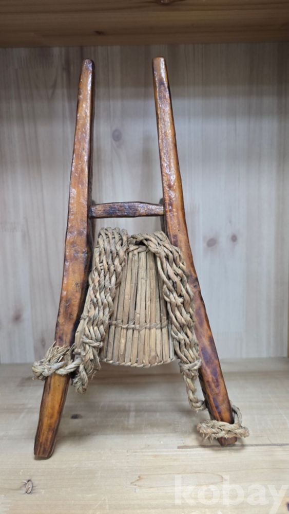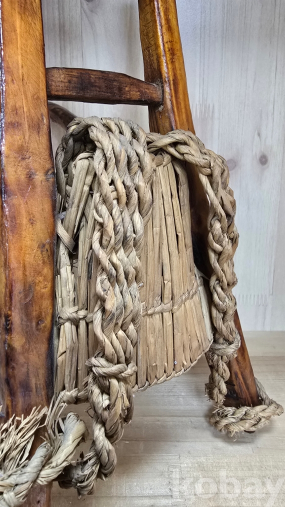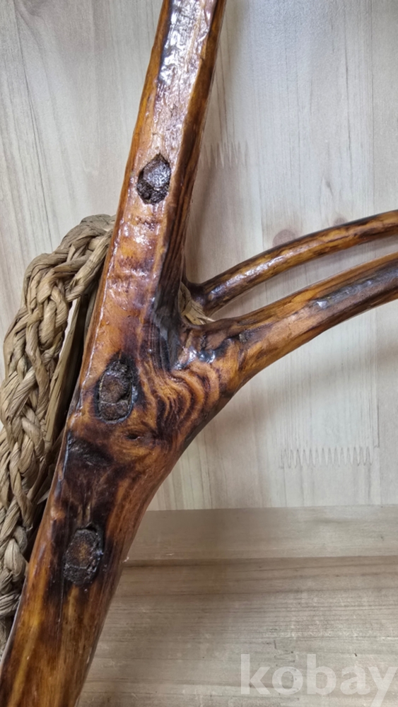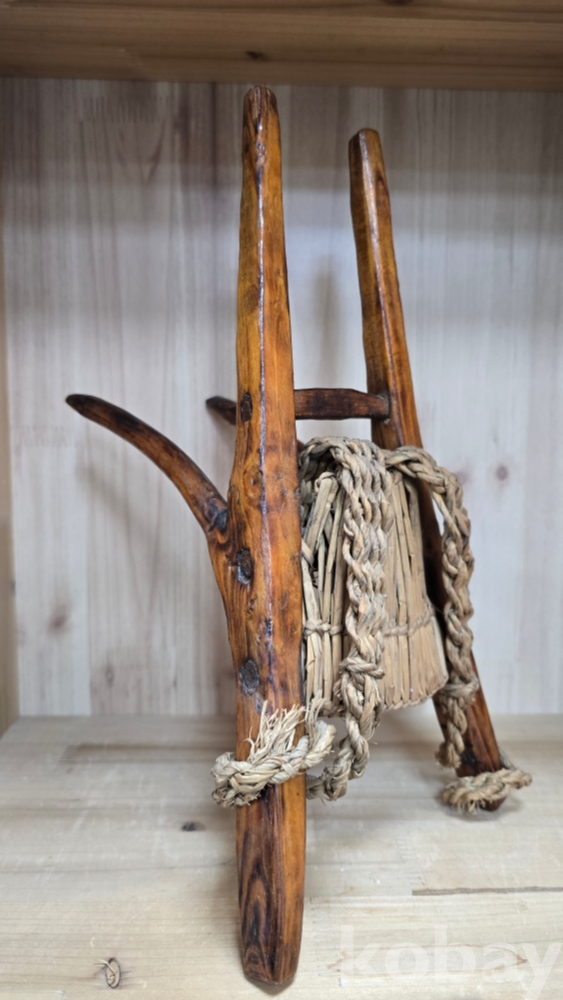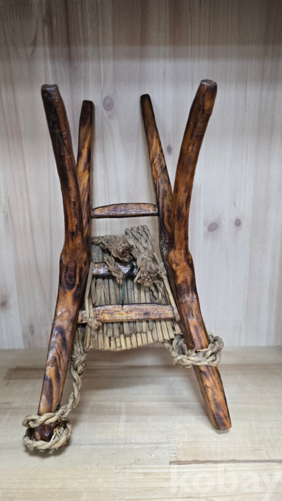 사진에서 보시듯, 자연스러운 나뭇결이 살아있는 지게 본체에 짚으로 정교하게 엮은 멜빵과 등받이가 그대로 재현되어 있습니다.