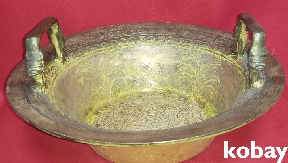 연대가 매우 좋은 황동(黃銅)으로 만든 공명이 울리는 양손잡이 대야로 쌍용 (雙龍)문양 조각품입니다,