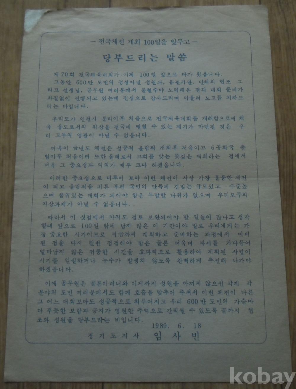 1989년 전국체전 경기도지사 안내장