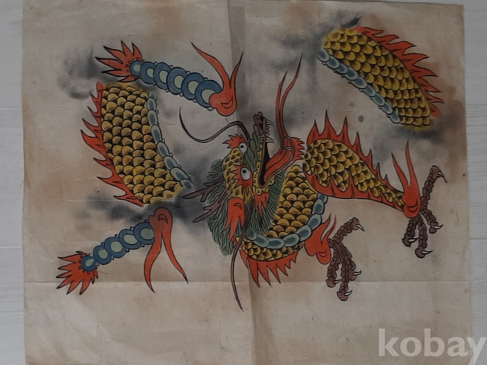 작가나 제작년도에 대한 표기는 없으나 오래된 한지에 그린 민화풍의 용그림, 반품불가, 반품시 반품비용 구매자부담조건 판매, 사이즈는 정확하지 않음