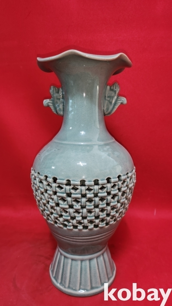 광명도예 비색청자 ( 翡色 靑磁) 투각 구름과 학(雲鶴)문양 화형 광구병입니다,