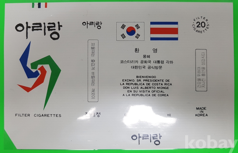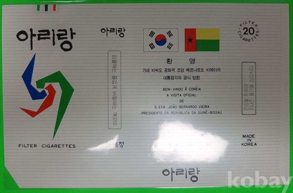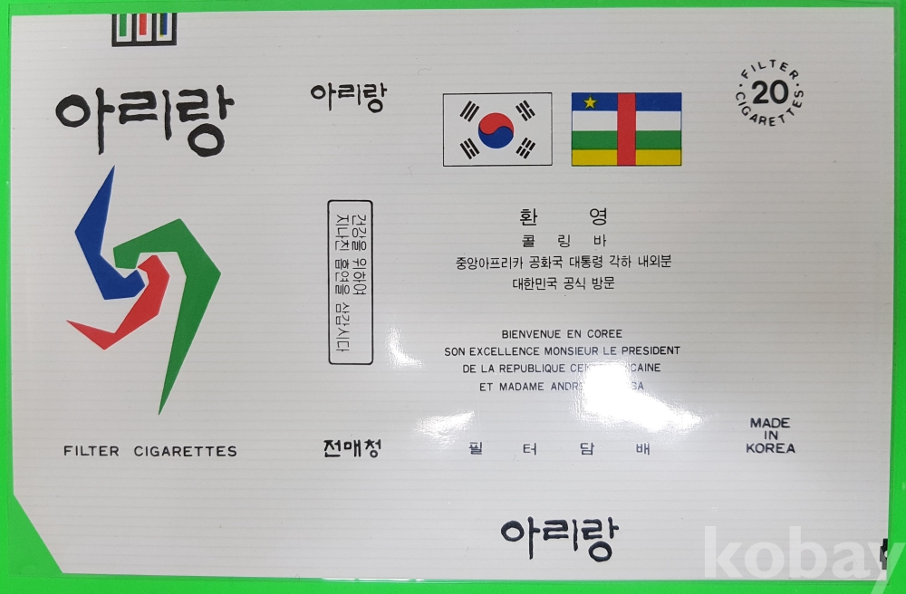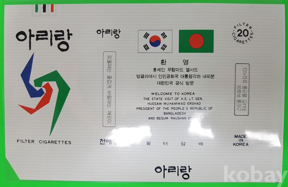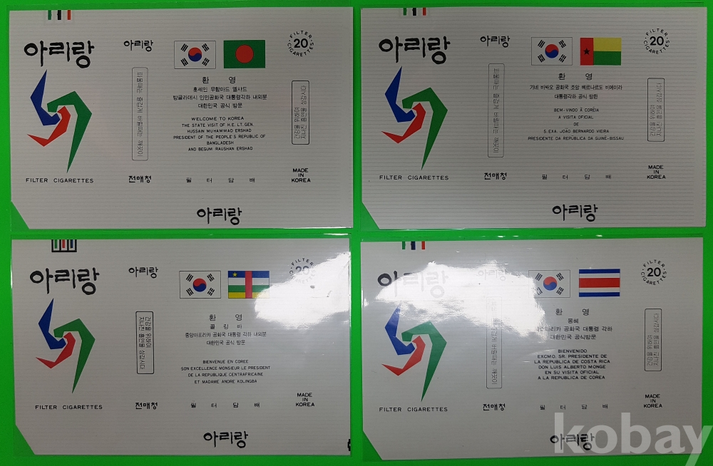 **** 아리랑 담배포갑지 (외국원수 방문 기념)/몽헤 코스타리카 공화국 대통령각하, 기네 비싸오 공화국 조앙 베르나르도 비에이라, 콜링비 중아아프리카 공화국 대통령각하 내외분, 훗세인 무함마드 엘사드 방글라데시 인민공화국 대통령각하 내외분