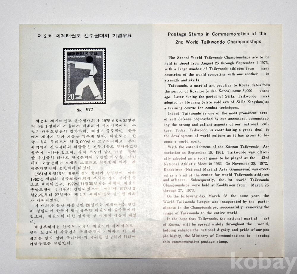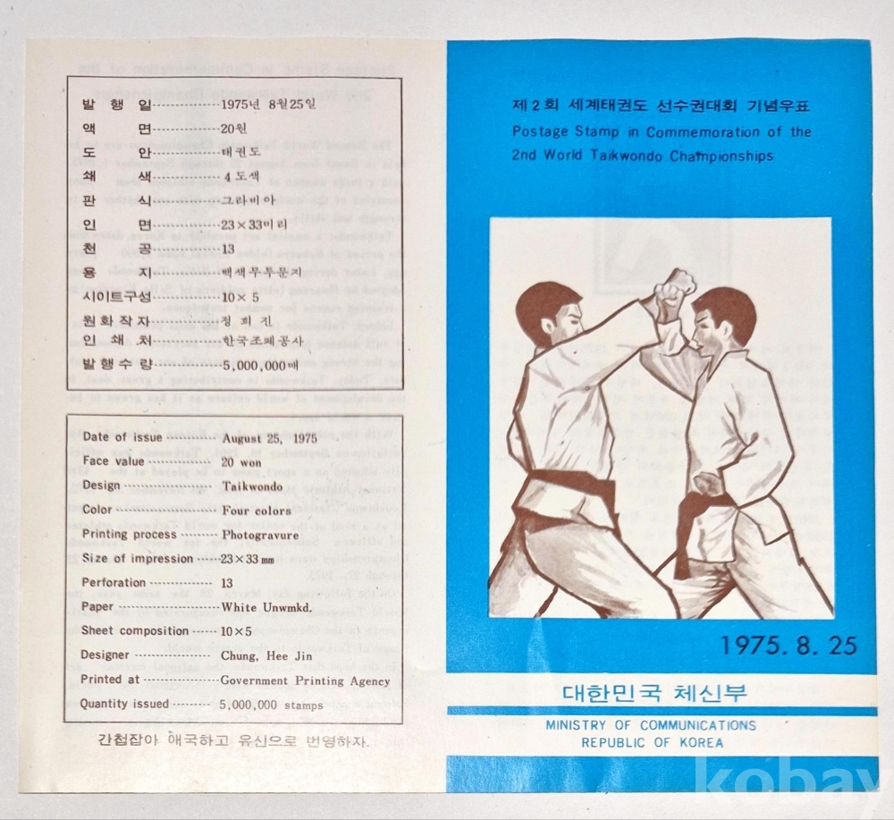1975년 8월 25일 발행된 제2회 세계태권도 선수권대회 기념우표 안내카드 입니다.