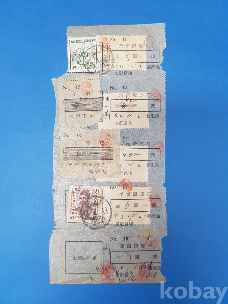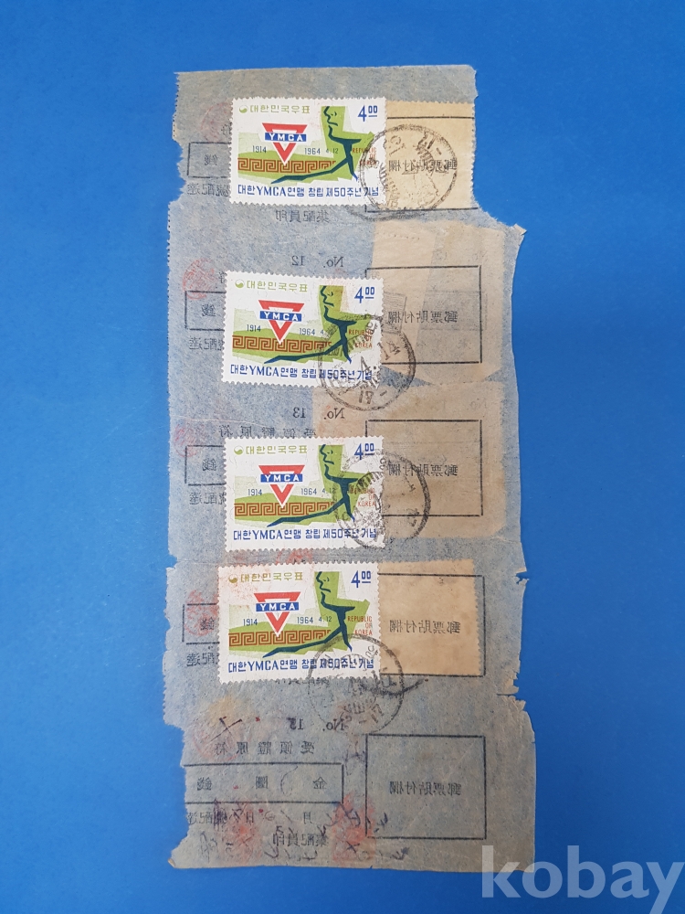 **** 1964년 새원화우정투문보통 농부,세종,YMCA50년 4매 첩부 우편요금수령증원부*밀양,64.4.11