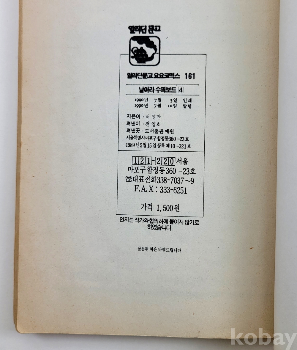 물 품 명 | [요요코믹스] 허영만 / 날아라 수퍼보드 제4권 / 1990년 초판 / 도서출판 예음 |