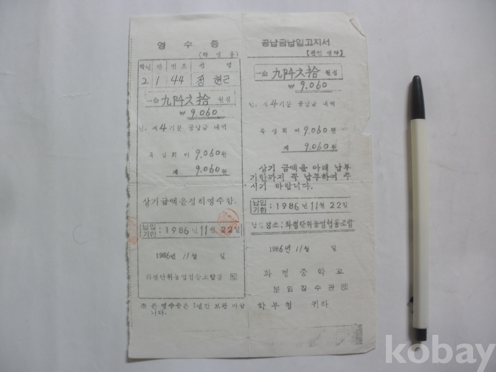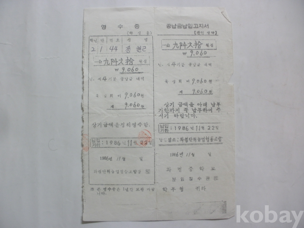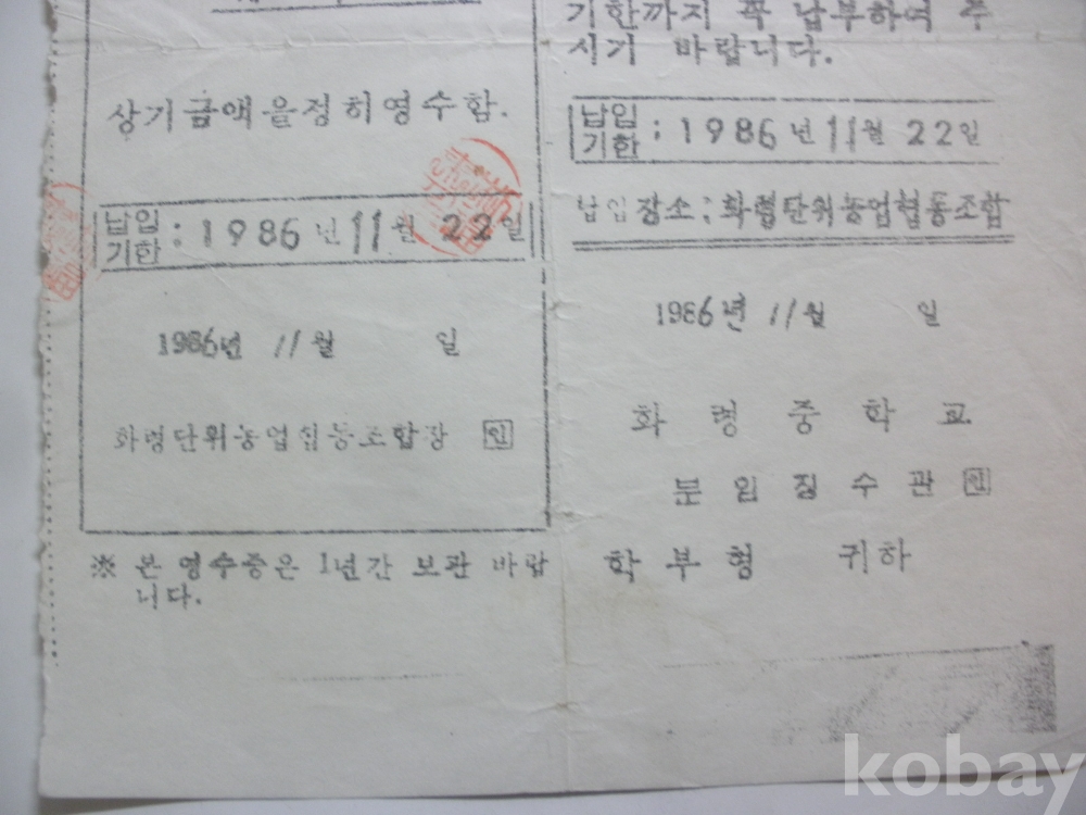 화령중학교 공납금 납입고지서 - 육성회비 (1986년)