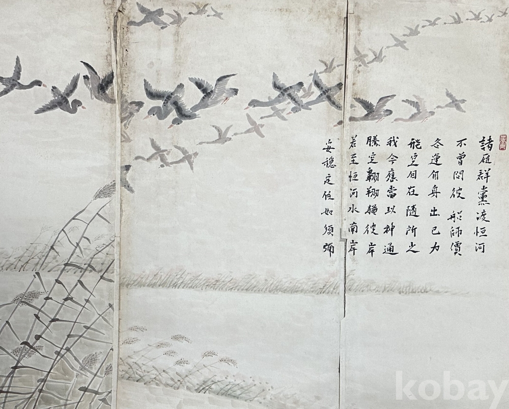 본 작품은 여러 마리의 기러기가 강 위를 날아오르는 장면을 묘사한 수묵담채화입니다. 화면 좌측에는 바람에 흔들리는 갈대가 부드럽게 그려져 있으며, 상단에는 기러기들이 대열을 이루어 비상하는 모습이 표현되어 있습니다. 중앙에는 한시가 쓰여 있고, 우측에는 기러기의 움직임이 점차 멀어지는 구도로 배치되어 있어 공간감이 살아 있습니다. 필선은 부드럽고 농묵과 담묵의 조화가 안정적으로 구성되어 있으며, 전체적으로 차분하고 여백이 많은 구도가 특징입니다. 좌측에 ‘이희열(李喜烈)’의 서명이 적혀 있고 낙관이 찍혀 있습니다.