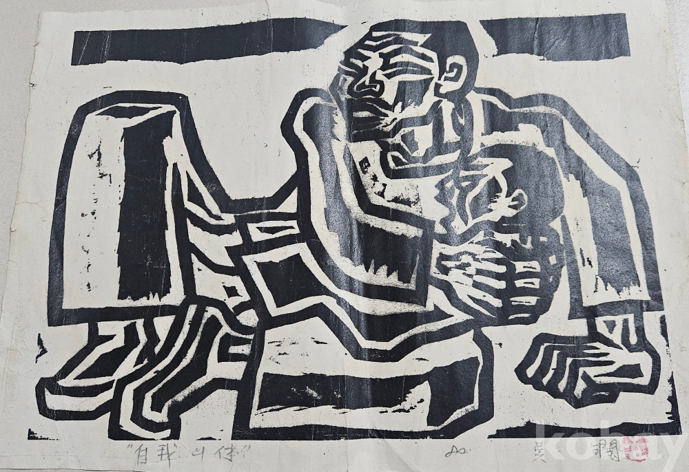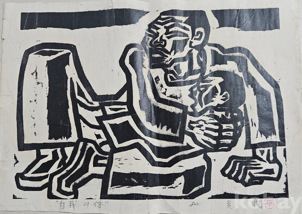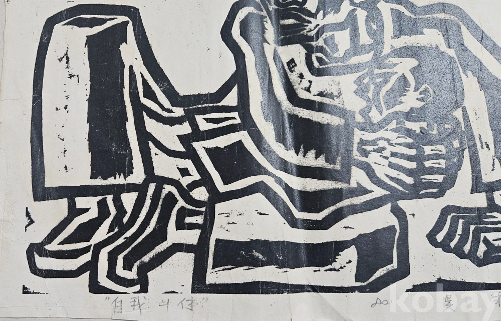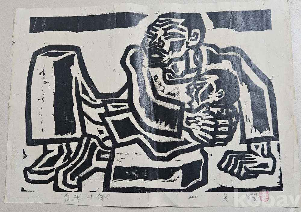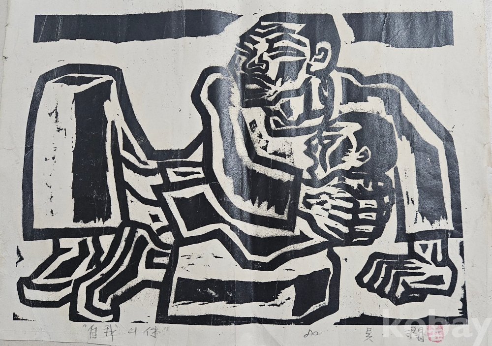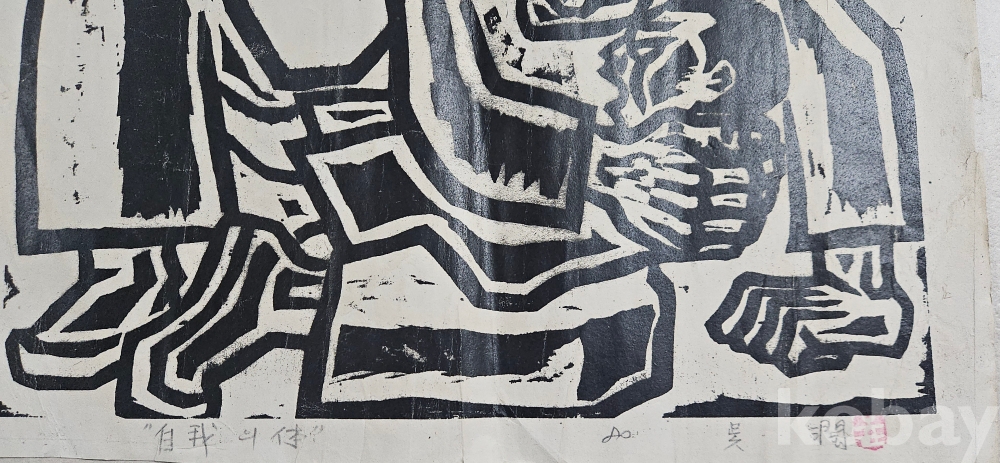 .제목("自我의 休 80",(吳潤,오윤 ) 작가수결 있는판화