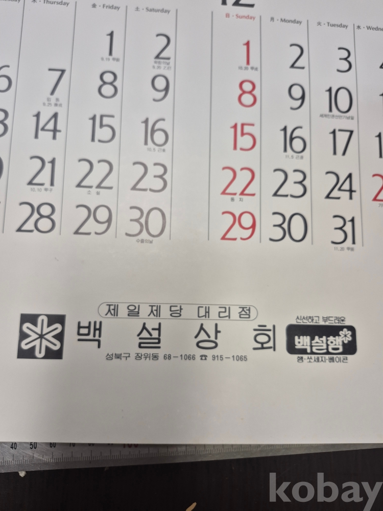 1985년 제일제당 주식회사 달력 제일제당 대리점 백설햄 서울 성북구 장위동 백설상회 달력 미사용품 51*77