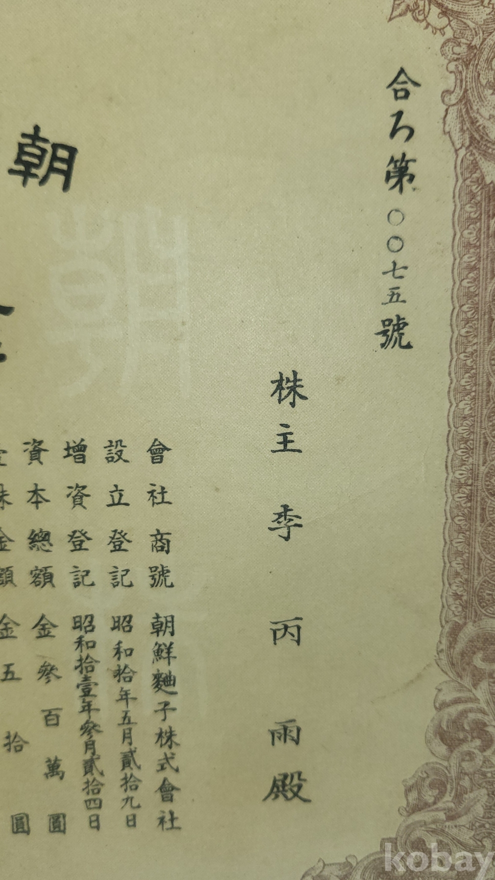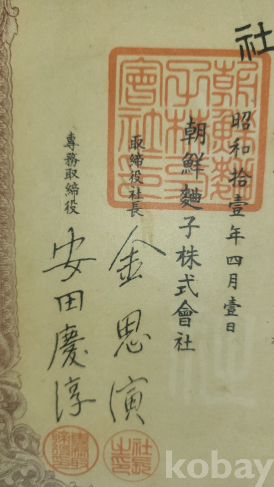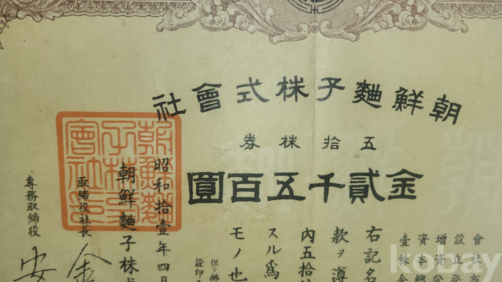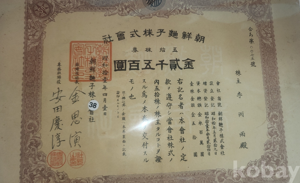 1936년(쇼와11년)조선식산은행 (朝鮮殖産銀行)에서 발행한 주식증서입니다,